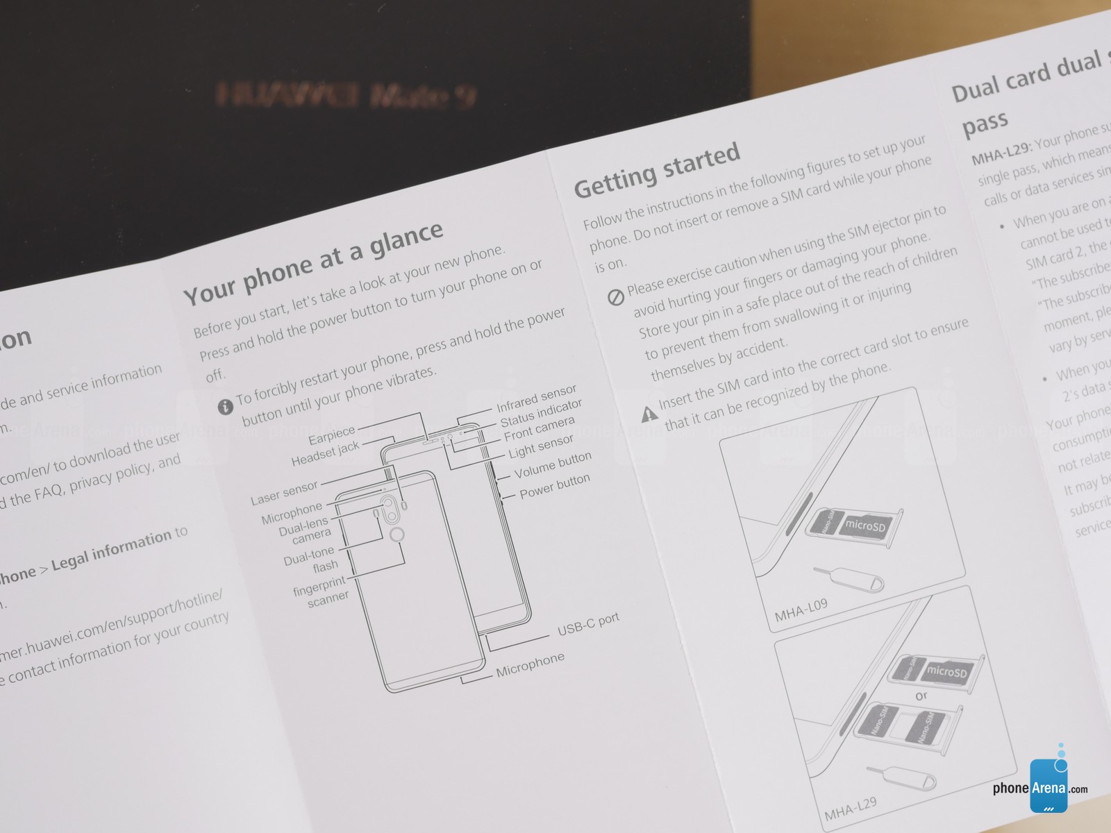 بسته بندی هواوی برای میت ۹ تفاوت زیادی با آنچه با میت ۹ و پی ۹ دیدیم ندارد. بسته بندی میت ۹ همانند میت ۸ با رنگ مشکی ارائه شده در حالی که در سری پی ۹ شاهد رنگ سفید برای بسته بندی بودیم. درب جعبه را که باز کنید تفاوت زیادی با میت ۸ وجود ندارد. همه لوازم جانبی همراه با یکدیگر یکسان است به جز یک عدد تبدیل USB Type C که همانند آنچه در گلکسی نوت ۷ دیدیم همراه میت ۹ را به رایگان ارائه می شود. هواوی یک عادت جالب دارد و آن ارائه گارد شفاف نازک همراه پرچمداران خود است و این سبب می شود شما از خرید محافظی بی نیاز باشد.