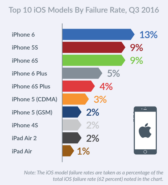 به گزارش گروه Blannco Technology، در سه ماهه سوم سال ۲۰۱۶، بیش از ۶۲ درصد آیپدها و آیفون‌های اپل از مشکل رنج می‌بردند. اما در مقابل دیوایس‌های اندرویدی تنها ۴۷ درصد مشکل را به خود اختصاص دادند.