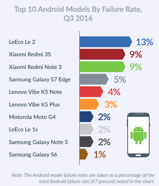 در سویی دیگر دیوایس‌های اندرویدی چون LeEco Le 2 با ۱۳ درصد رتبه نخست را داشته و پس از آن Redmi 3S و Redmi Note 3 با سهمی ۹ درصدی رتبه دوم و سوم را داشتند. به دنبال آنها Galaxy S7 edge سامسونگ با سهمی ۵ درصدی و Vibe K5 Note لنوو با سهمی ۴ درصدی در رتبه‌های چهارم و پنجم جای گرفتند.
