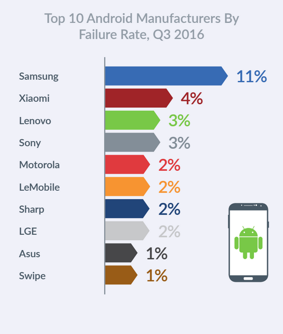 Blannco Technology افزود که دیوایس‌های اندرویدی در ۷ درصد مشکل از مسئله باتری رنج برده و در ۶ درصد نیز با مشکل صفحه‌نمایش دست و پنجه نرم می‌کردند. همچنین در بخش کمپانی‌ها نیز سامسونگ با سهمی ۱۱ درصدی رتبه نخست را داشته و شیائومی با سهم ۴ درصد در رتبه دوم جای گرفته است.