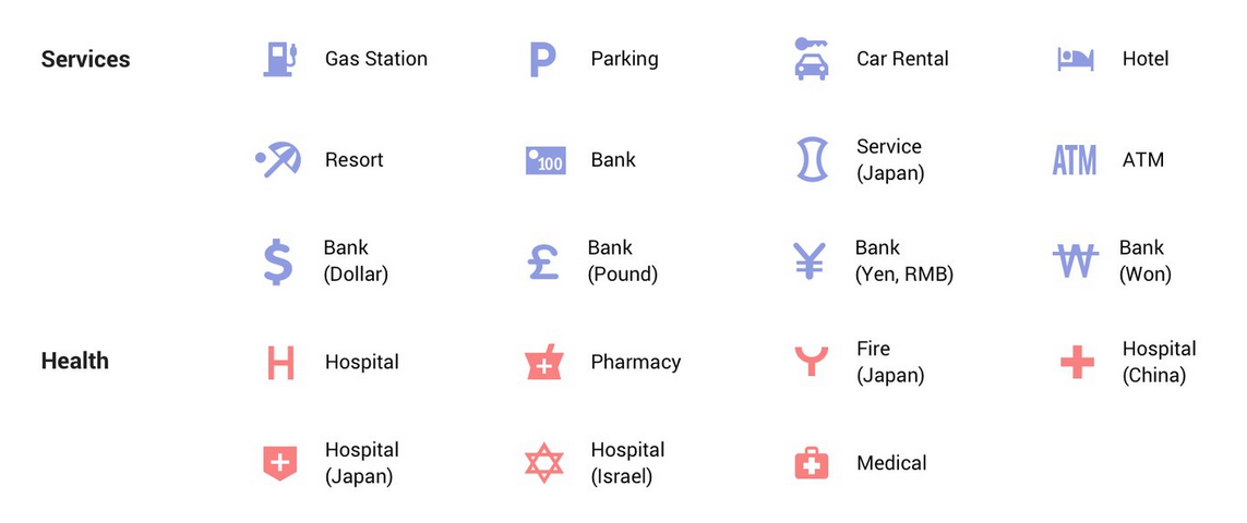 در ادامه‌ی این تغییرات، سرویس گوگل‌مپ (Google Map) از طرح‌های رنگی جدید و آیکون‌های تازه در هر بخش بهره‌مند خواهد شد تا بیش از پیش به تسریع انجام امور مورد‌نیاز کابران کمک کند. برای مثال اگر شما نیاز اورژانسی به نزدیکترین بیمارستان موجود داشته باشید، تمایز طرح ها و رنگ‌های مورد استفاده می‌تواند به شما کمک شایانی در تشخیص و مسیریابی هر چه سریع‌تر آن بر روی نقشه داشته باشد. همچنین علاقه‌مندان به رستوران‌ها و فروشگاه‌های عرضه‌ی نوشیدنی نیز می‌توانند این اماکن را با آیکون فنجان قهوه‌ی نارنجی رنگ در نقشه تشخیص دهند.