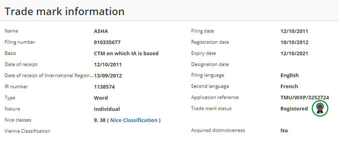 طبق اسناد دیده شده شرکت فنلاندی HMD برند Asha را برای خود در اداره مالکیت معنوی اتحادیه اروپا ثبت کرده است. هر چند این برند نیز توسط مایکروسافت خریده شده بود اما به نظر میرسد با ثبت برند آشا توسط HMD احتمالا توافقاتی صورت گرفته است. اسناد مذکور را در تصاویر زیر می بینید: