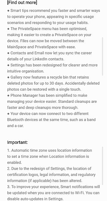 حجم آپدیت مورد بحث ما 2.6 گیگابایت میباشد که همراه با حضور نسخه 8.0 رابط کاربری هواوی میباشد. همچنین ویژگیهایی مثل مدت زمان 30 روزه سطل آشغال تصاویر و دوباره طراحی کردن تنظیمات این رابط کاربری به چشم میخورد.