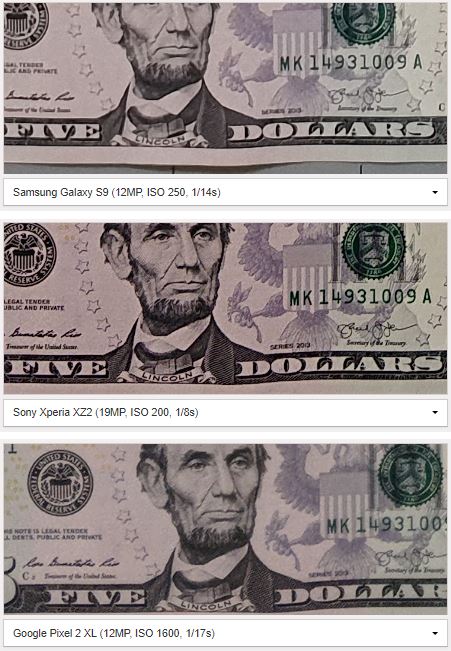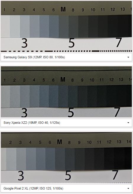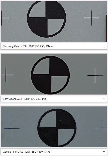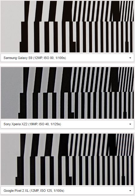 صفحه مقایسه دوربین وب سایت Gsmarena چندین بخش دارد، شما می توانید در شرایط نوری ضعیف و قوی 3 دستگاه را انتخاب کرده و عکس هایی که از صفحه مرجع گرفته شده را کنار یکدیگر قرار دهید. ما برای این 3 دستگاه گزینه های اکسپریا ایکس زد 2 با گلکسی اس 9 و پیکسل 2 ایکس ال را انتخاب کرده و برش های مختلف را با هم مقایسه نمودیم. می توانید در دو گالری زیر آن ها را ببینید: