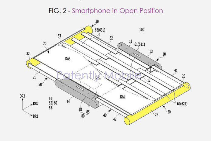 اینکه آیا پتنت مذکور هم اکنون قابل ارایه باشد قطعا پاسخ خیر است اما نشان می دهد که سامسونگ در حال بازی با انواع حالت هایی که می تواند یک دستگاه کوچک به یک نمایشگر بزرگ تبدیل شود، است. در این پتنت علاوه بر نمایشگر خود دستگاه شاهد دو نمایشگر دیگر هستیم که با مکانیسم مکانیکی باز می شوند و به لطف حاشیه نمایشگر بسیار کمی که دارند در کنار یکدیگر قرار می گیرند تا یک نمایشگر یک پارچه را تولید کنند.
