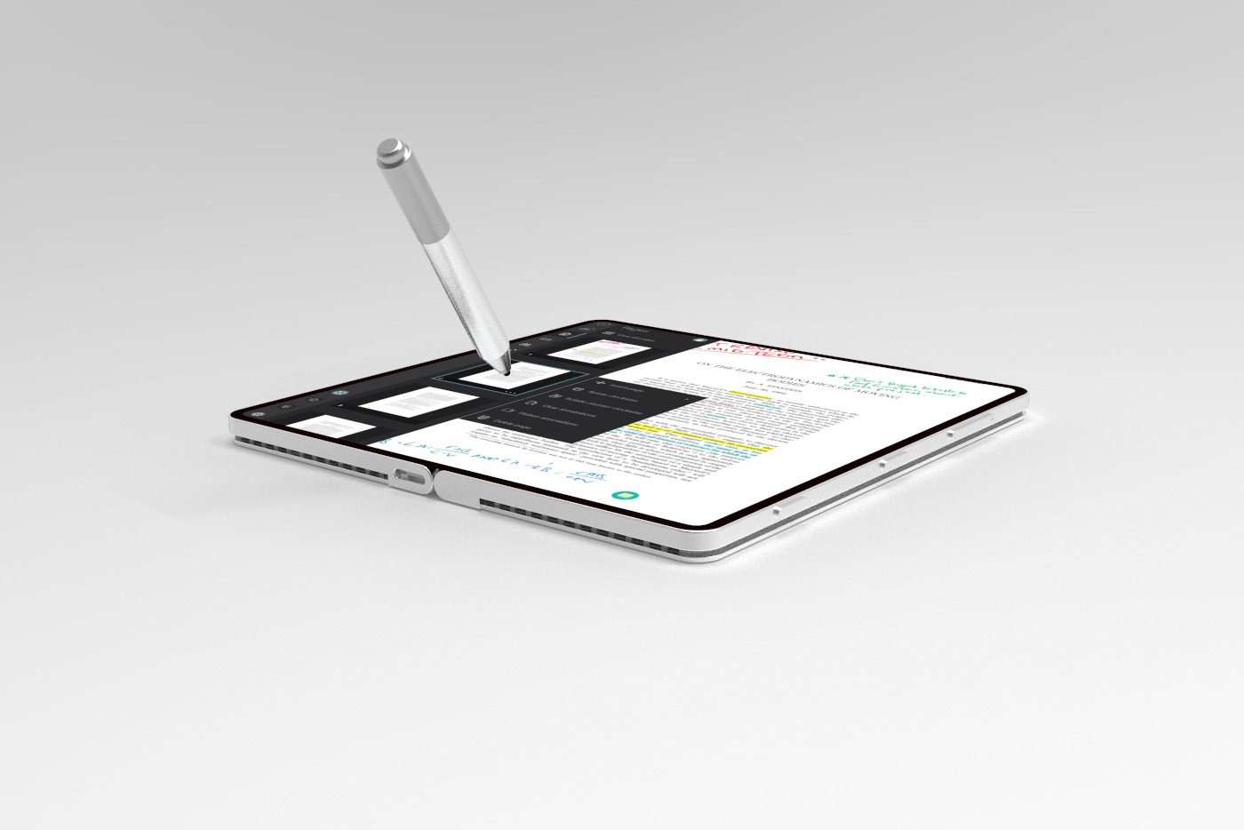 جالب است که در این طرح مفهومی سرفیس فون منعطف با قلم تصور شده است. اینکه نمایشگر منعطف بتواند دیجیتایزر مخصوص قلم را داشته باشد خود پرسشی است که برای پاسخش باید صبر کنیم! درباره لولا که تخصص مایکروسافت است و دستگاه هایی مانند سرفیس، سرفیس بوک، سرفیس هاب و سرفیس استودیو با لولاهای بی نظیر تولید کرده است باید گفت احتمالا شاهد حالتی خواهیم بود لولا قفل کند و سرفیس فون منعطف شبیه به یک لپتاپ قرار بگیرد، بدون نیاز به پایه یا کیس خاص!
