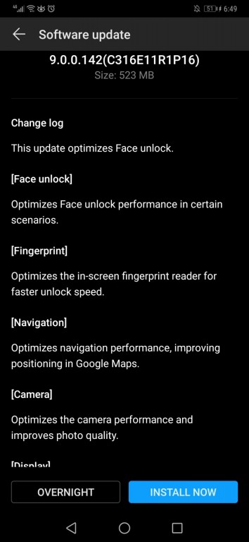در آپدیت هوآوی میت ۲۰ پرو پیشرفت هایی در کیفیت دوربین ارایه می شود و توضیحات بیشتری در این زمینه وجود ندارد. همچنین سرعت و دقت راه های احراز هویت بیومتریک Mate 20 Pro یعنی سیستم تشخیص چهره با دوربین مادون قرمز و حسگر اثرانگشت یکپارچه با نمایشگر افزایش خواهد یافت. همچنین عملکرد مکان یابی نیز بهتر می شود و در گوگل مپ موقعیت صحیح تر شما نشان داده خواهد شد.
