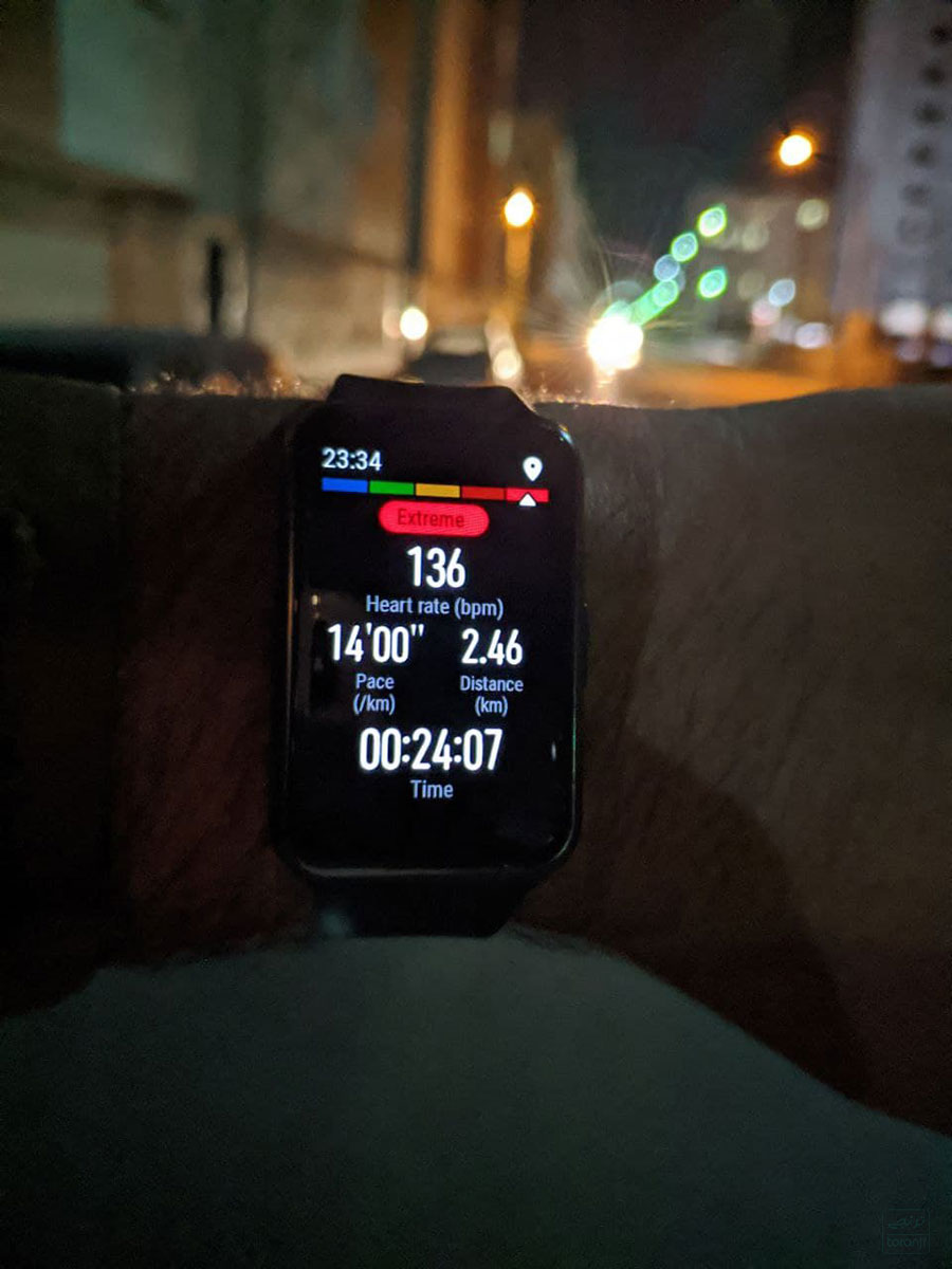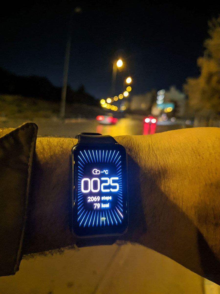 در تصویر بالا هم می توانید چراغ فوه با نمایشگر هواوی واچ فیت را ببینید. این به ما اندازه کامل نمایشگر و حاشیه ها را نشان می دهد. هر چند شاید در این سناریو، خیلی به مفید بودن آن پی نبرید اما در فضاهای کاملا تاریکی که چراغ قوه نیاز دارید، لنگه کفشی در بیابان است!