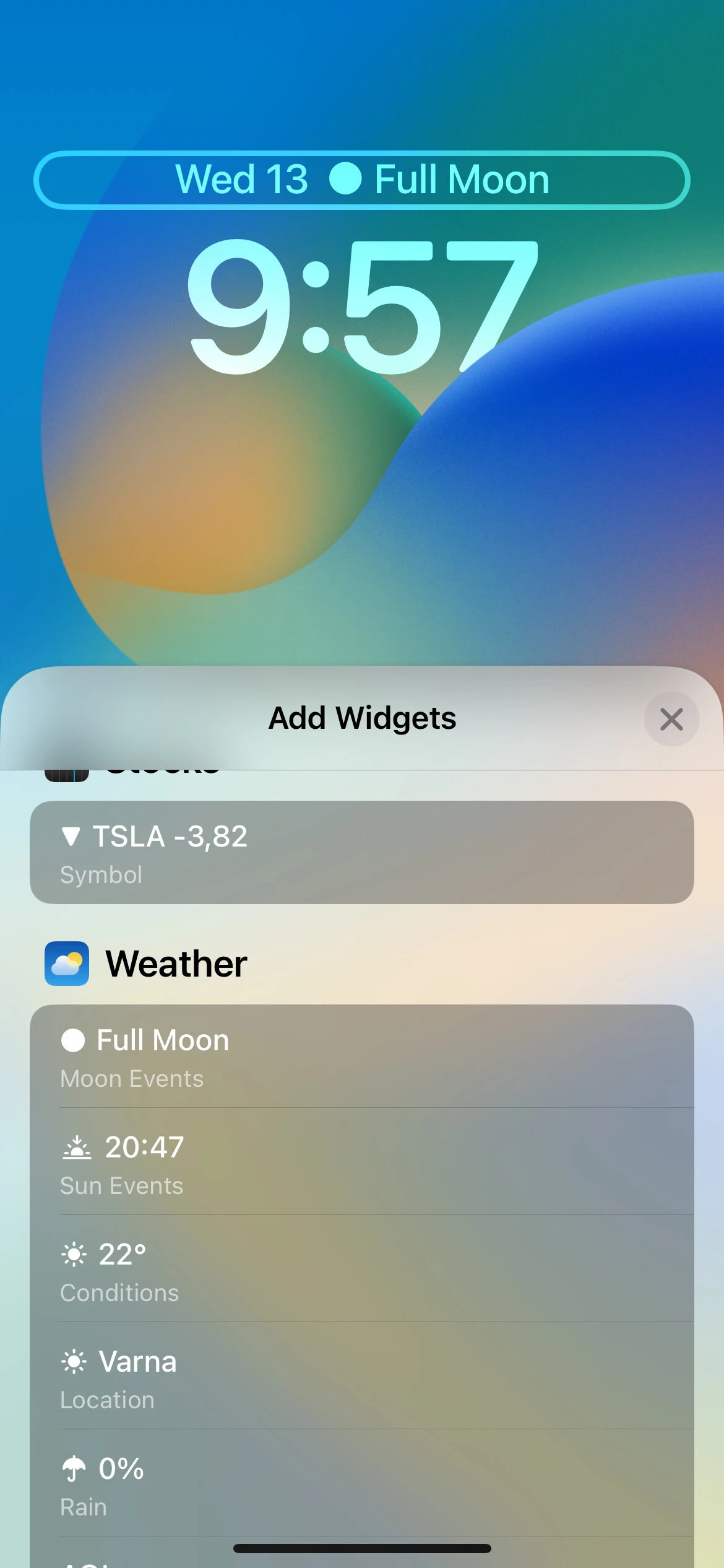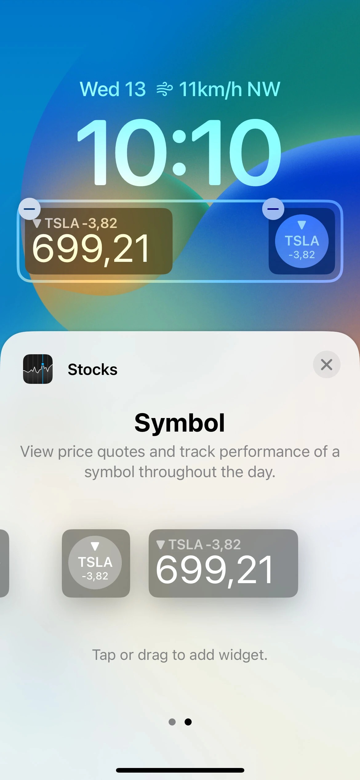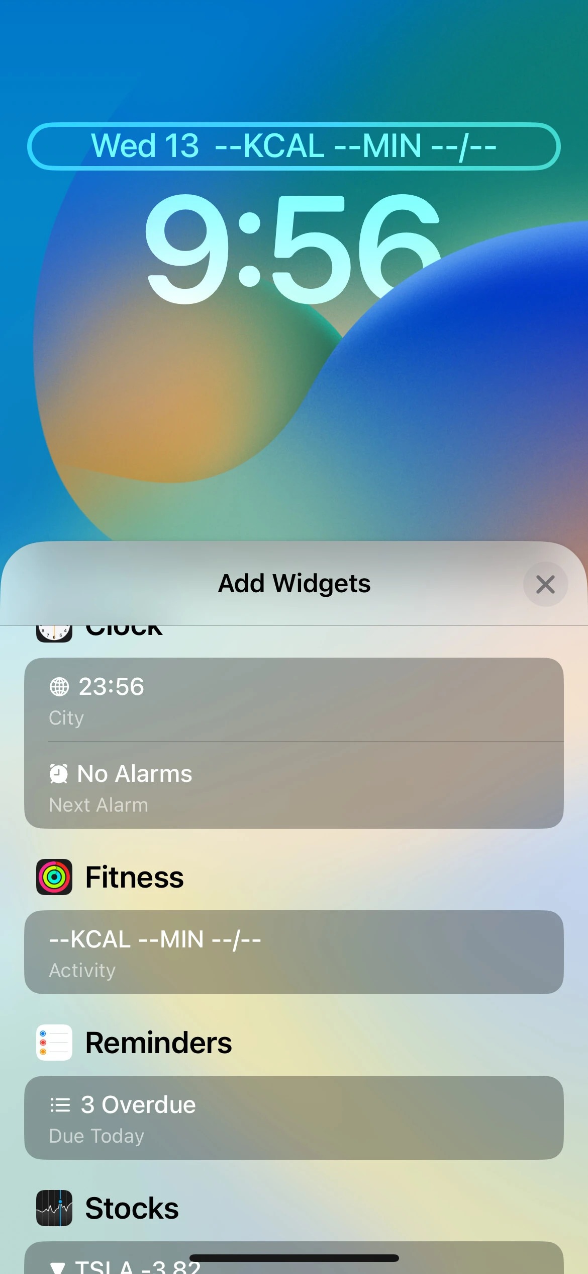 کسانی که در بازار سهام معامله می‌کنند، می‌توانند سه ویجت را برای صفحه قفل خود تنظیم کنند. با iOS 16، اپل یک ویجت برای فهرست تماشا را نیز ارائه می‌کند که به کاربران اجازه می‌دهد تا عملکرد حداکثر سه شرکت را در طول روز ردیابی کنند، همچنین یک ویجت کوچک و یک ویجت با دو اندازه برای نظارت بر عملکرد یک شرکت واحد وجود دارند.