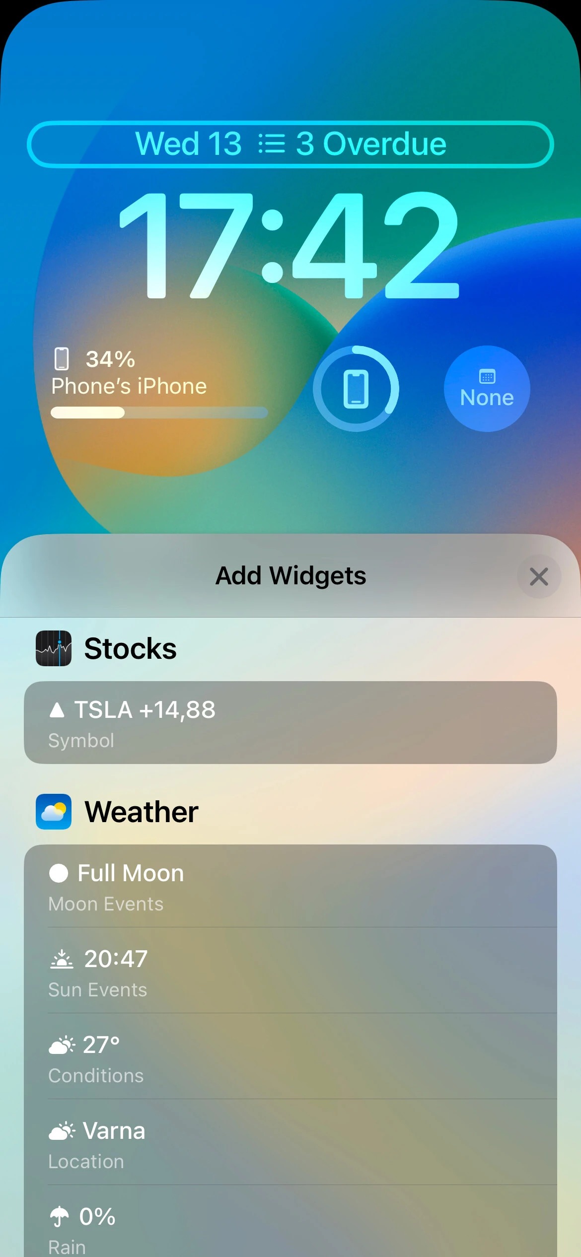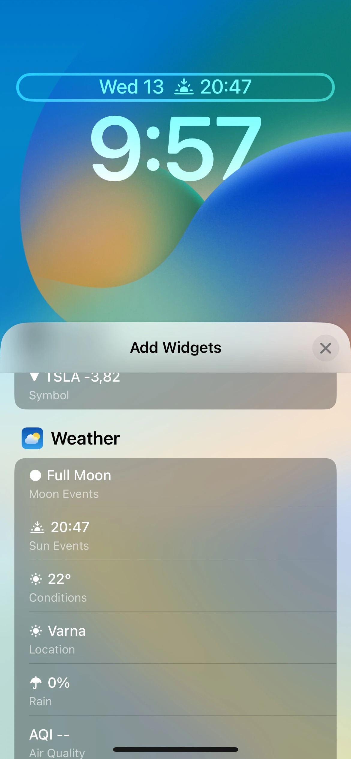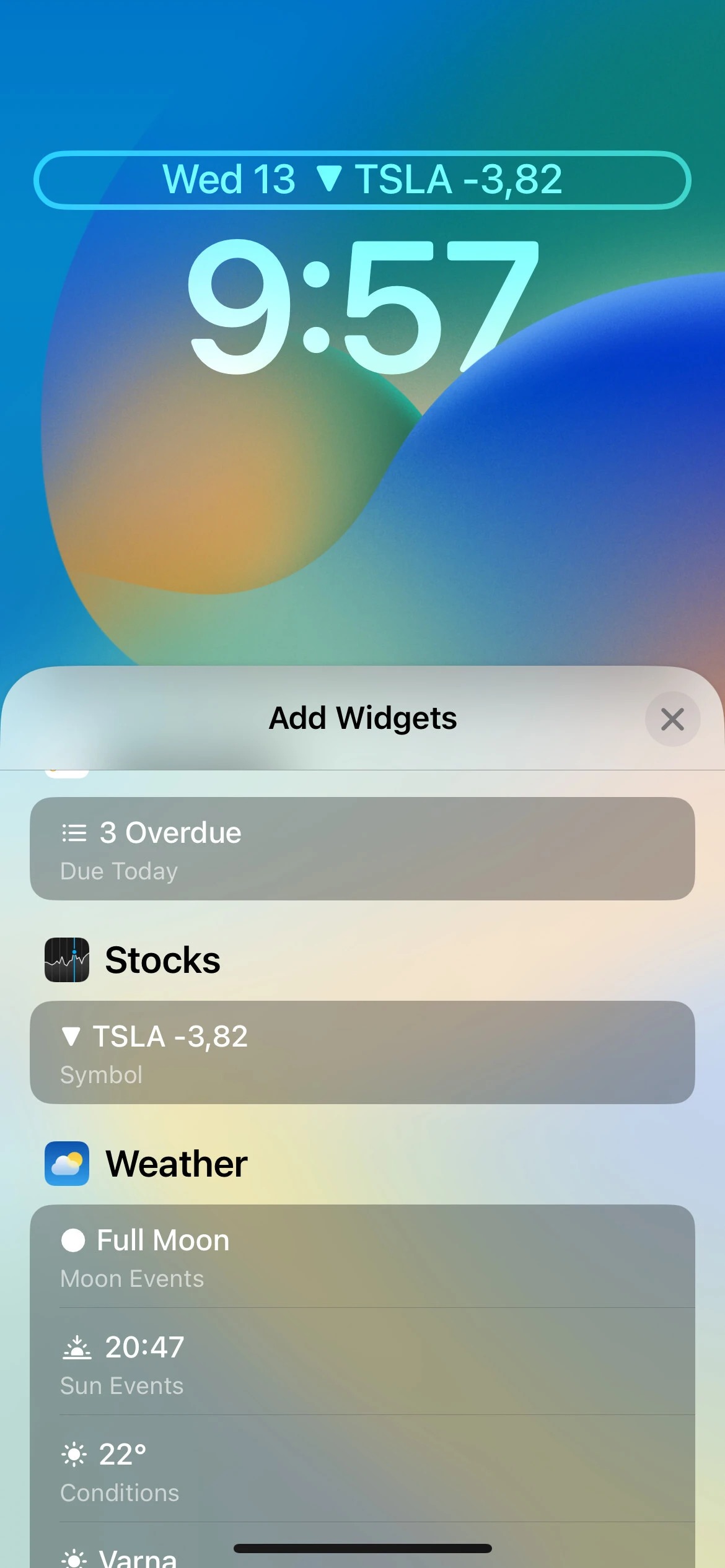 کسانی که در بازار سهام معامله می‌کنند، می‌توانند سه ویجت را برای صفحه قفل خود تنظیم کنند. با iOS 16، اپل یک ویجت برای فهرست تماشا را نیز ارائه می‌کند که به کاربران اجازه می‌دهد تا عملکرد حداکثر سه شرکت را در طول روز ردیابی کنند، همچنین یک ویجت کوچک و یک ویجت با دو اندازه برای نظارت بر عملکرد یک شرکت واحد وجود دارند.