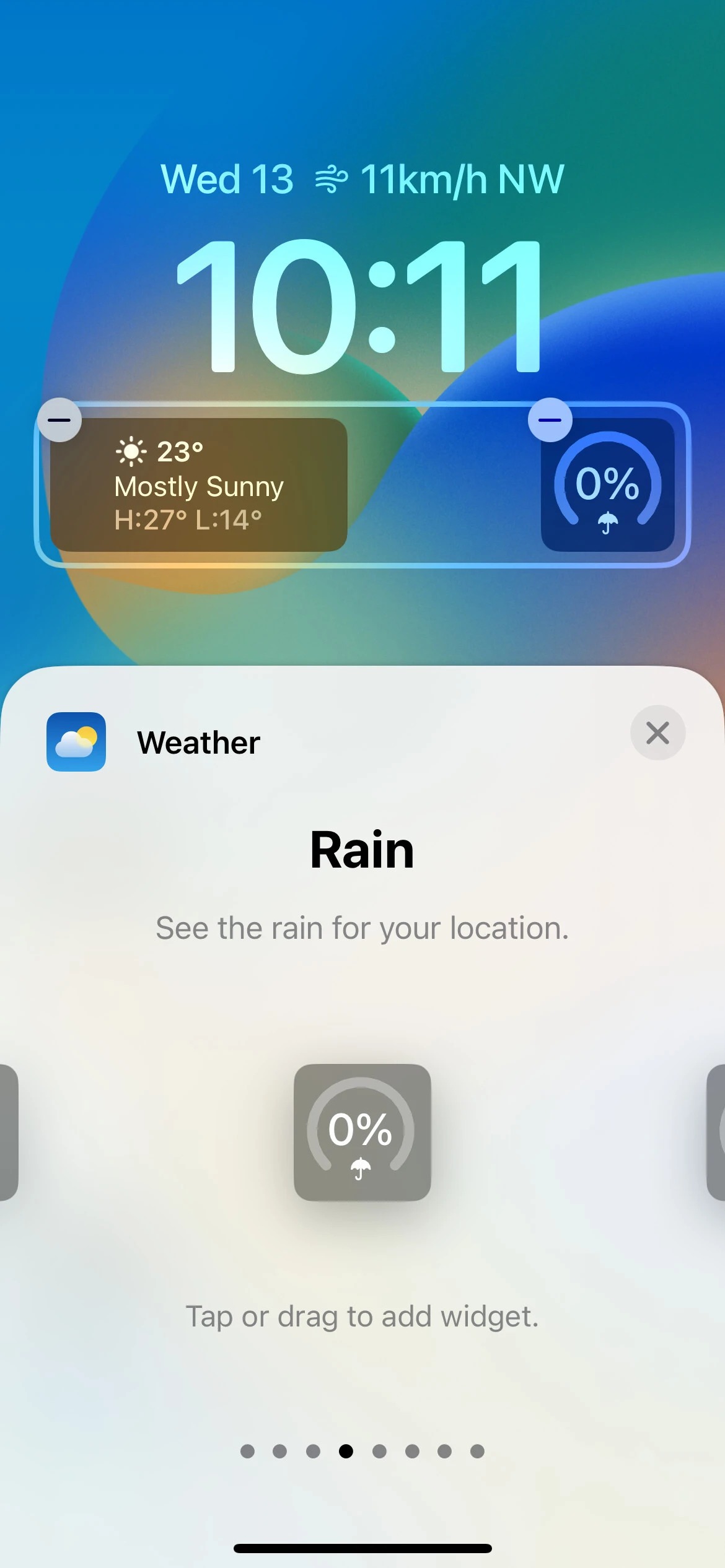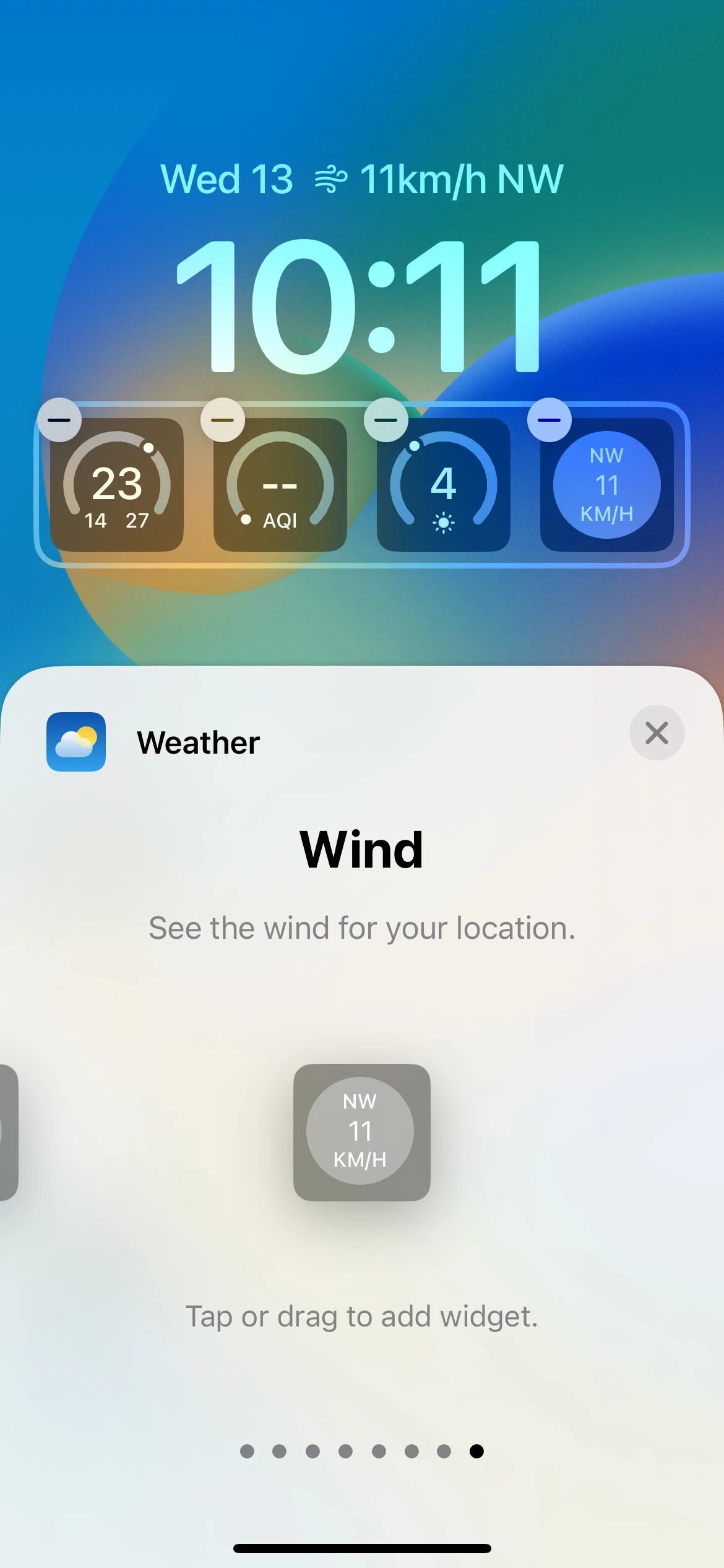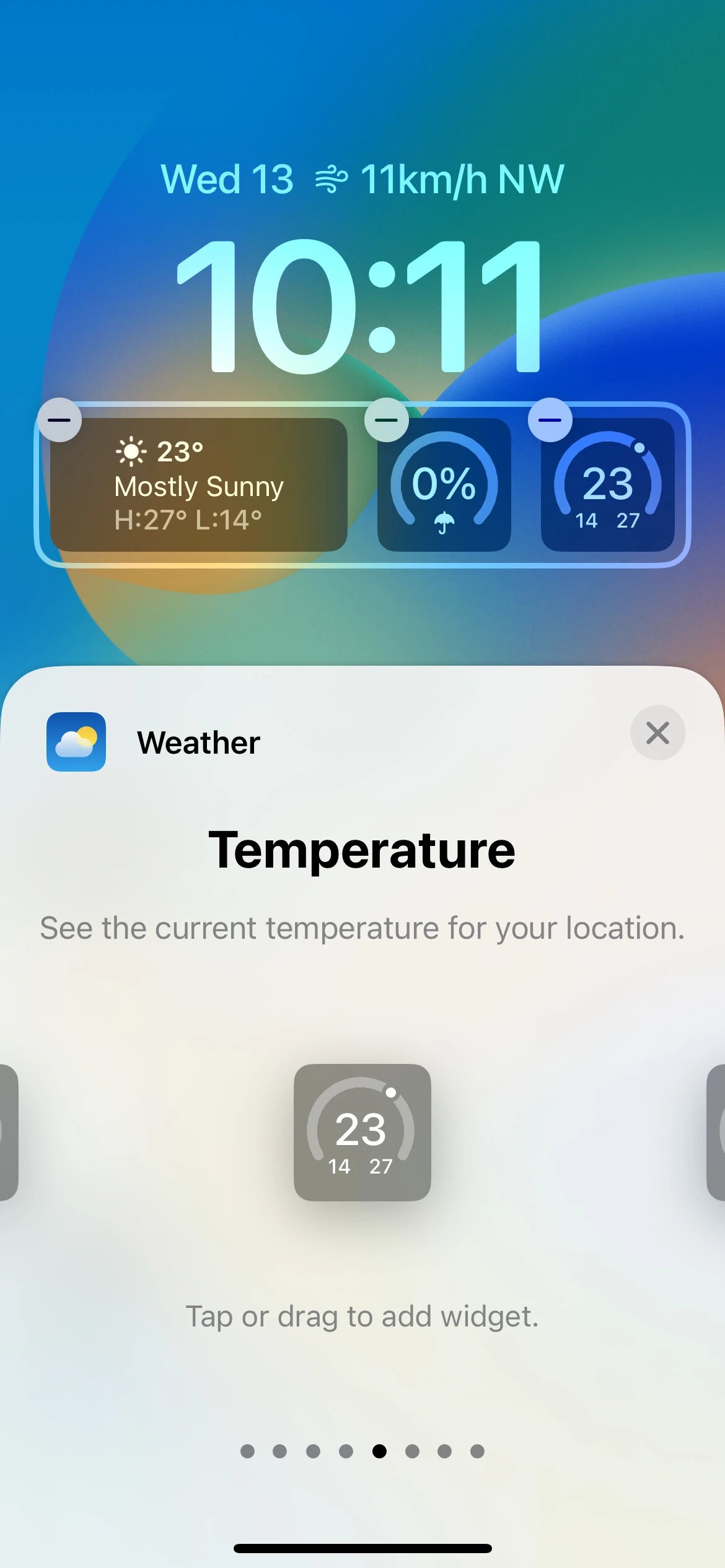با این حال، برنامه هواشناسی در حال حاضر بیشترین ابزارک‌ها را دارد. از طریق هشت ابزارک این برنامه، شما قادر خواهید بود وضعیت ماه فعلی را ببینید و هنگامی که خورشید غروب می‌کند و چه زمانی دوباره طلوع می‌کند را نیز در دسترس داشته باشید. همچنین این ابزارک وضعت دما و شرایط هواشناسی حال حاضر در منطقه شما و احتمال بارش باران را نیز نمایش می‌دهد. همچنین ویجت‌هایی وجود دارند که کیفیت فعلی هوا ، شاخص UV و سرعت باد را نشان خواهند داد.