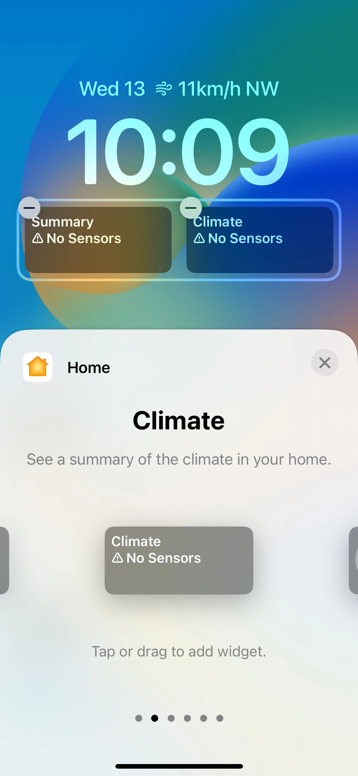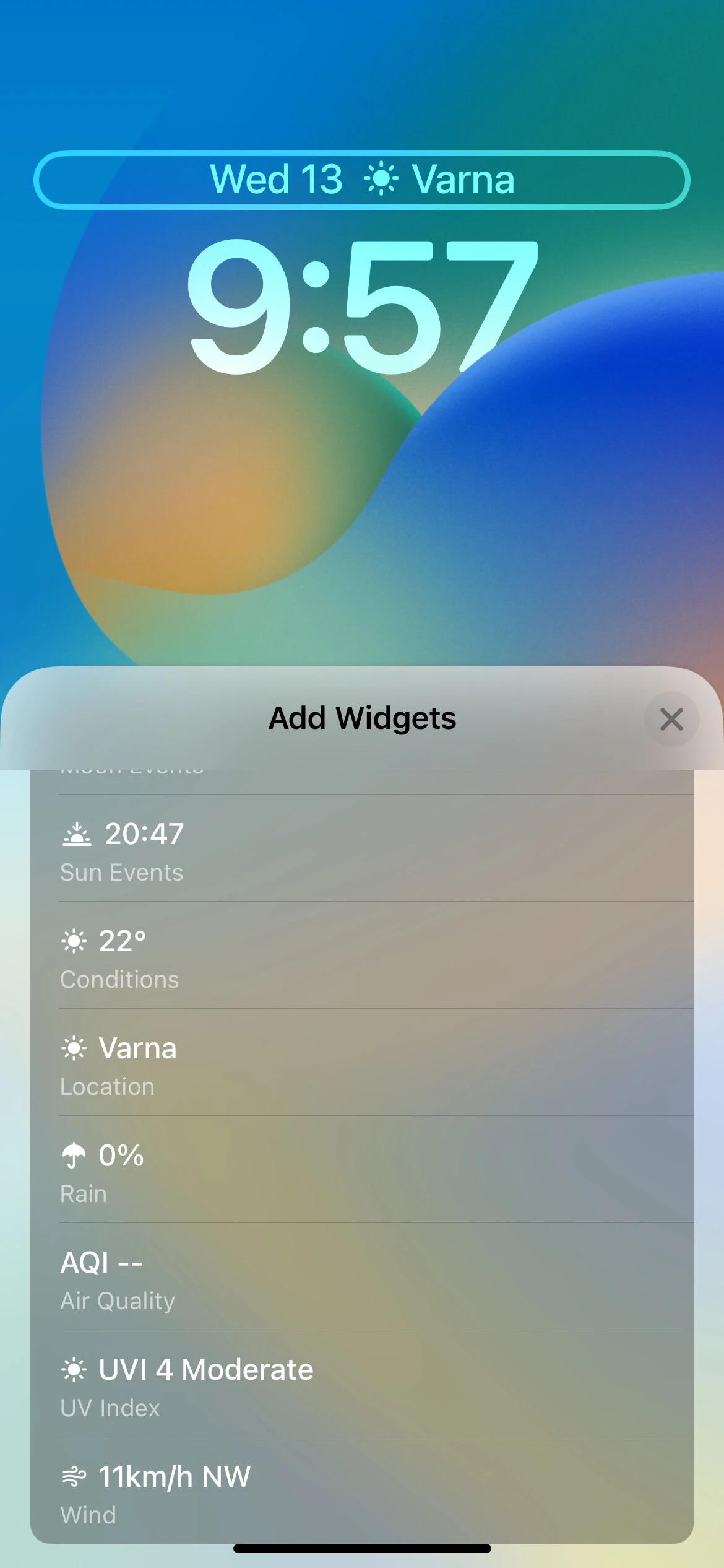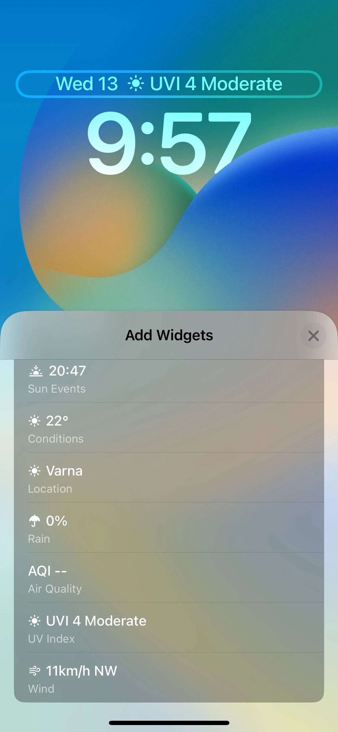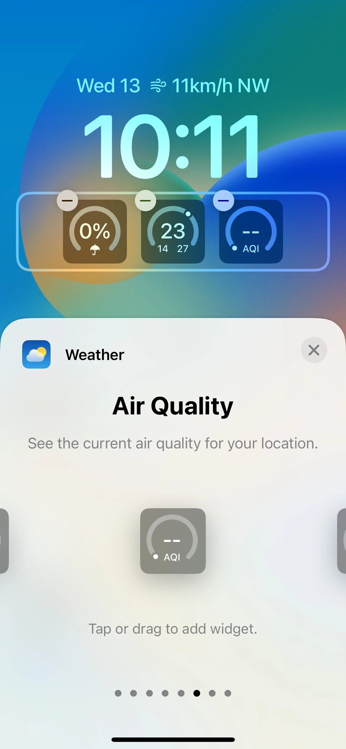 با این حال، برنامه هواشناسی در حال حاضر بیشترین ابزارک‌ها را دارد. از طریق هشت ابزارک این برنامه، شما قادر خواهید بود وضعیت ماه فعلی را ببینید و هنگامی که خورشید غروب می‌کند و چه زمانی دوباره طلوع می‌کند را نیز در دسترس داشته باشید. همچنین این ابزارک وضعت دما و شرایط هواشناسی حال حاضر در منطقه شما و احتمال بارش باران را نیز نمایش می‌دهد. همچنین ویجت‌هایی وجود دارند که کیفیت فعلی هوا ، شاخص UV و سرعت باد را نشان خواهند داد.