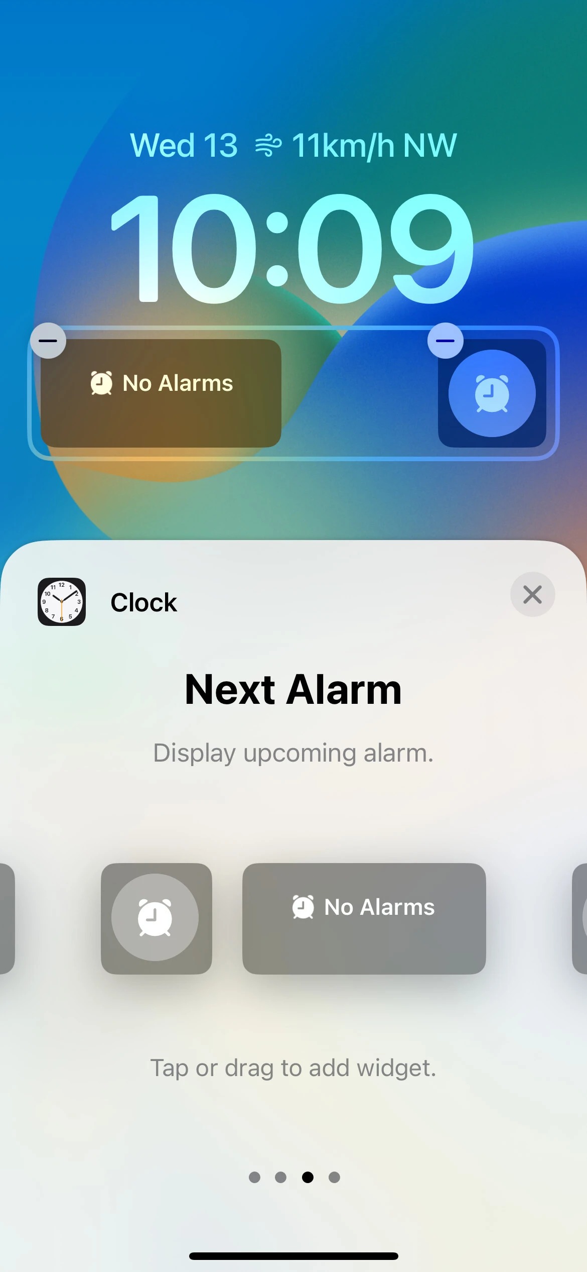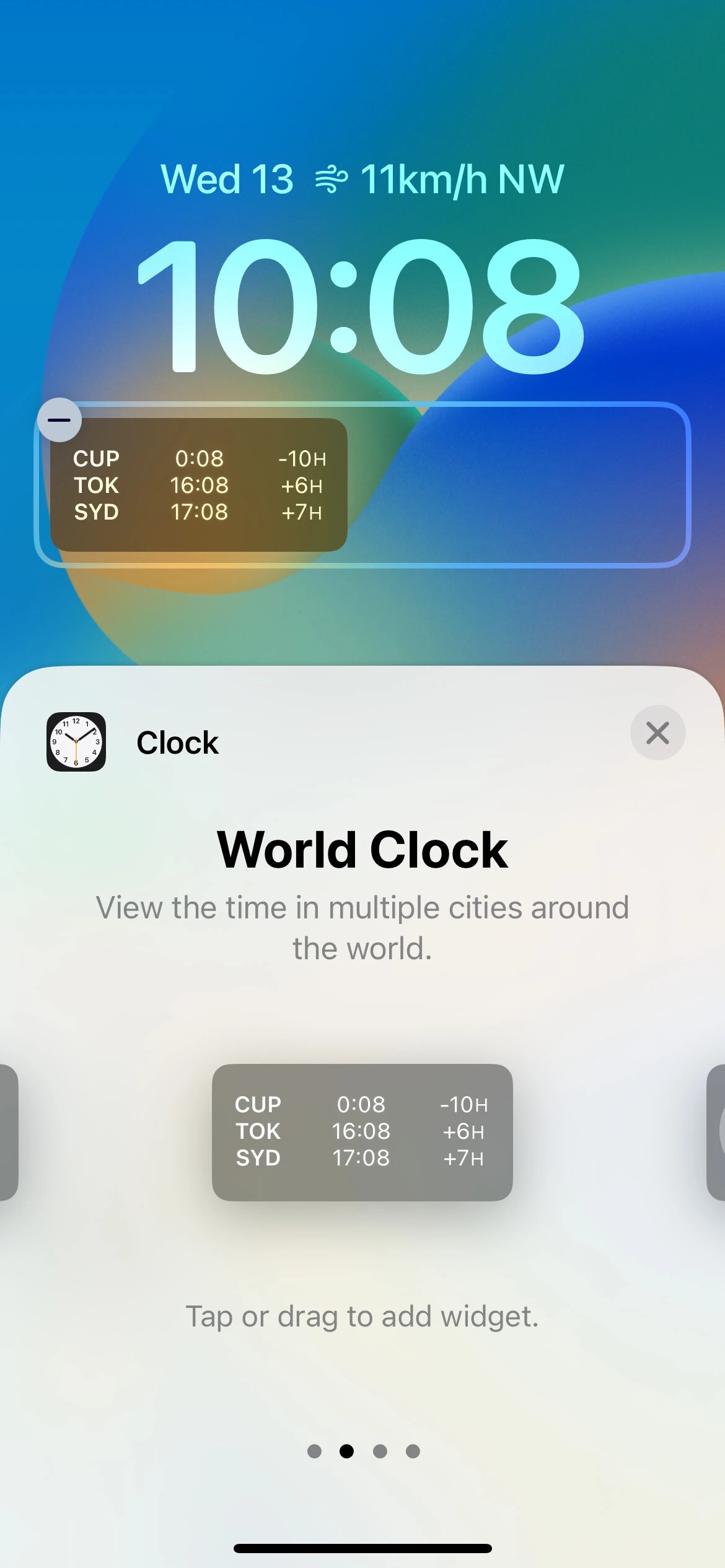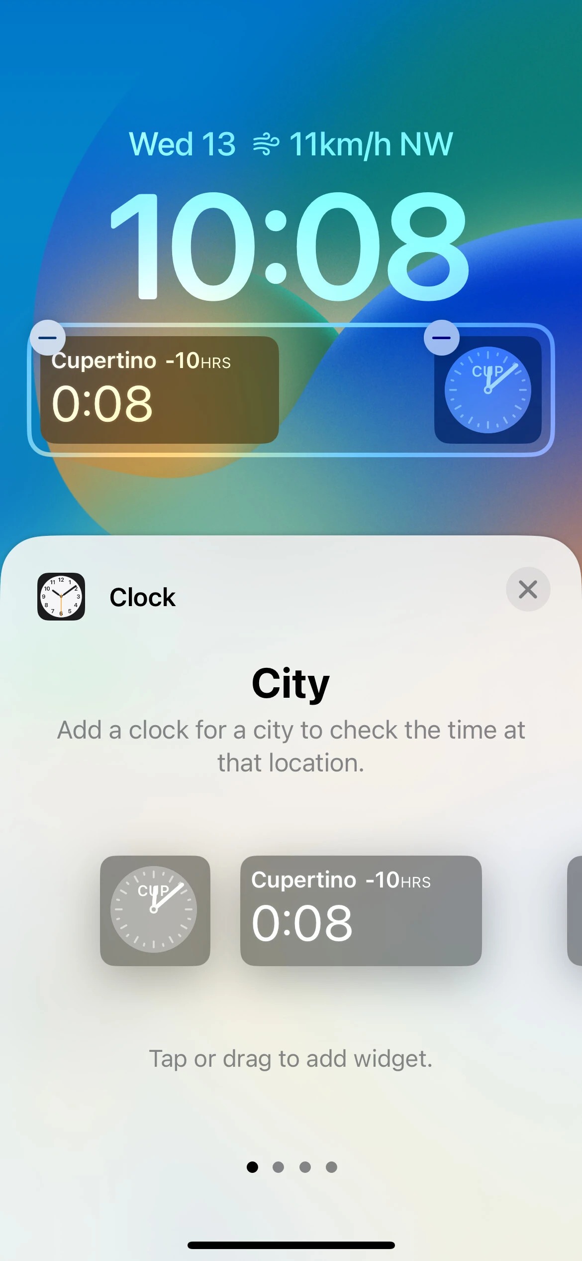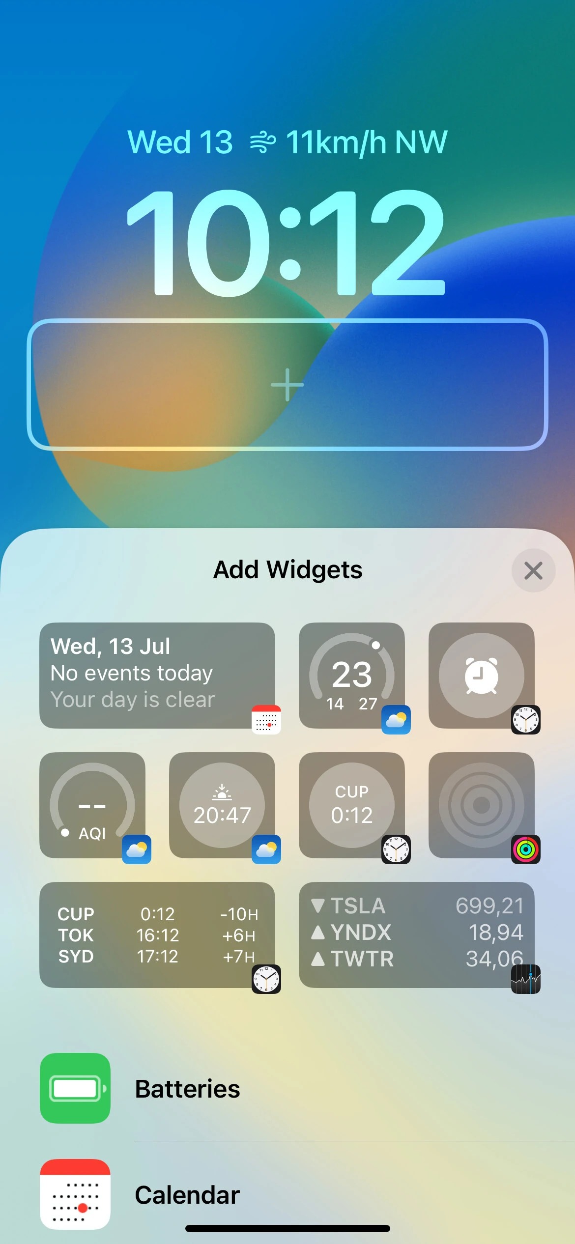 دو ابزارک برای برنامه تقویم وجود دارد که یکی که روز جاری هفته، تاریخ و ماه و موارد دیگر را نشان می‌دهد که رویداد بعدی شما را در آن جا قرار می‌دهد. برنامه ساعت همچنین دارای دو ابزارک است. مورد اول زمان زنگ هشدار بعدی را به شما نشان می‌دهد و دومین مورد نیز زمان فعلی را در یک شهر منتخب به نمایش می‌گذارد. به طور پیش فرض، ویجت دوم برای نمایش زمان در Cupertino تنظیم شده است، اما اگر در قسمت سفارشی سازی روی آن ضربه بزنید، می‌توانید شهرهای دیگری را نیز انتخاب کنید.