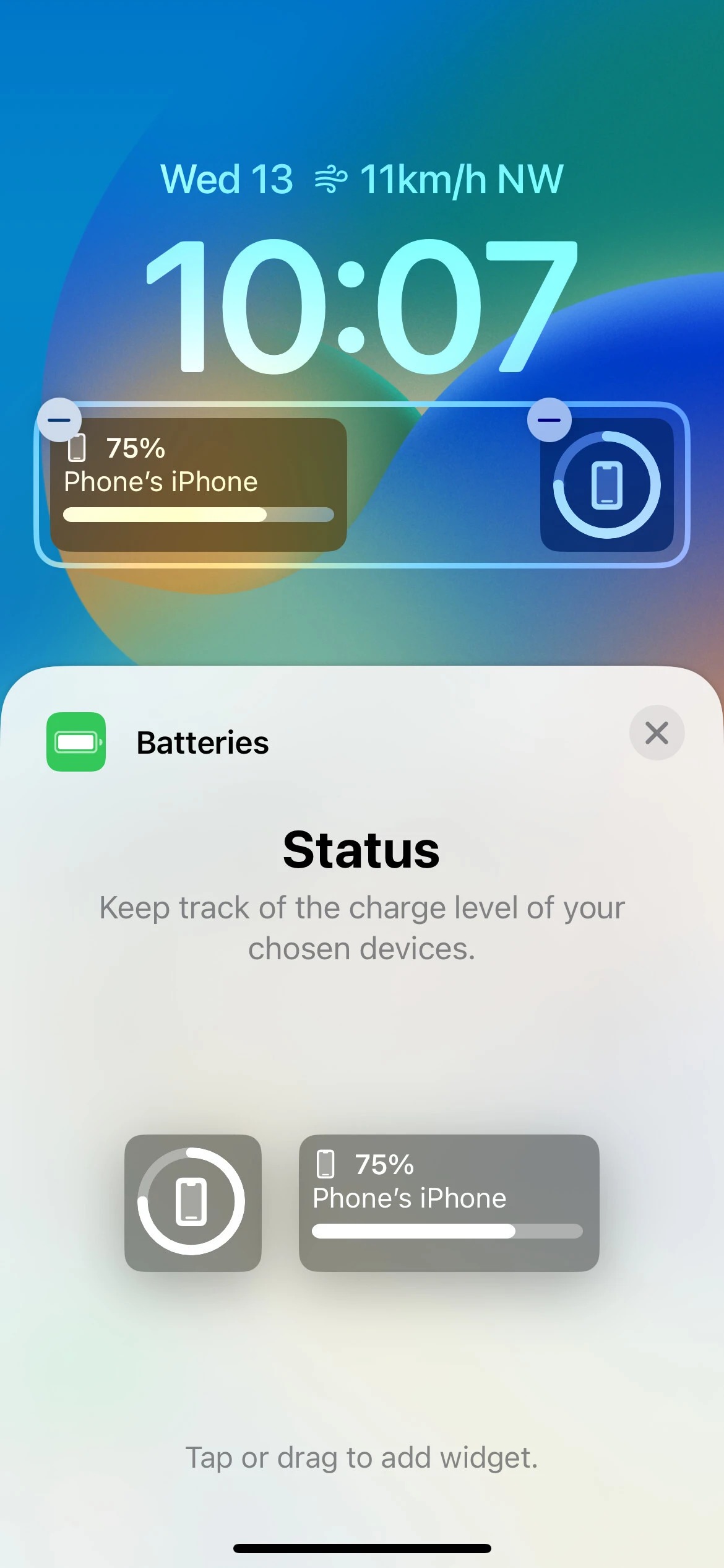 ابزارک‌های برنامه باتری، درصد باتری دستاگه شما یا لوازم جانبی متصل را نشان می‌دهد. ویجت کوچک‌تر فقط نشان می‌دهد که چه مقدار از باتری شما (از طریق نوار پیشرفت) باقی مانده است. اما مدل بزرگ‌تر، علاوه بر نوار پیشرفت، درصد باتری را نیز در شماره‌ها و نام تلفن یا لوازم جانبی متصل شما نشان می‌دهد. با حرکت به برنامه تقویم، ویجت کوچک‌تر در اینجا فقط زمان قرار ملاقات بعدی خود را به شما نشان می‌دهد. اما مدل بزرگ‌تر آن نیز نام این رویداد و زمان شروع و پایان آن را نشان خواهد داد.