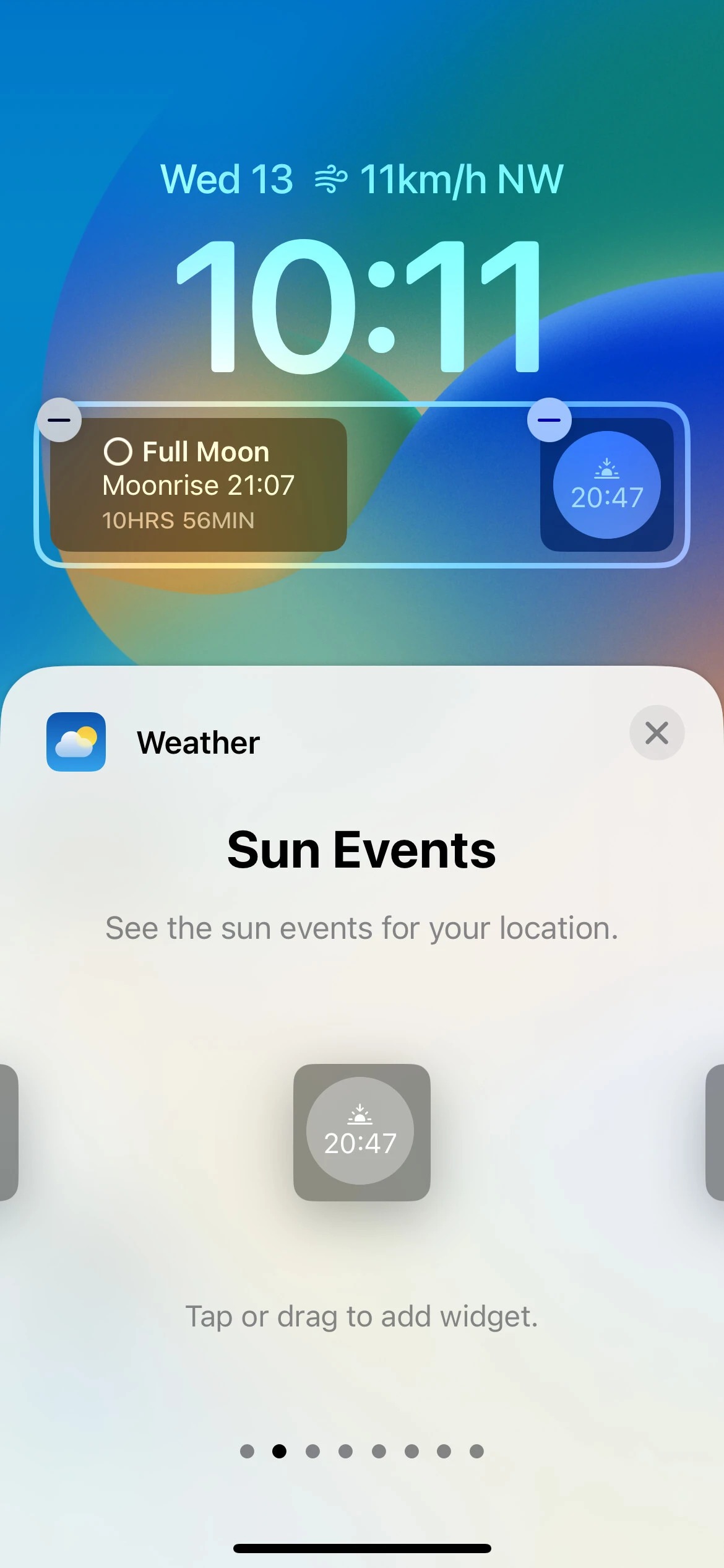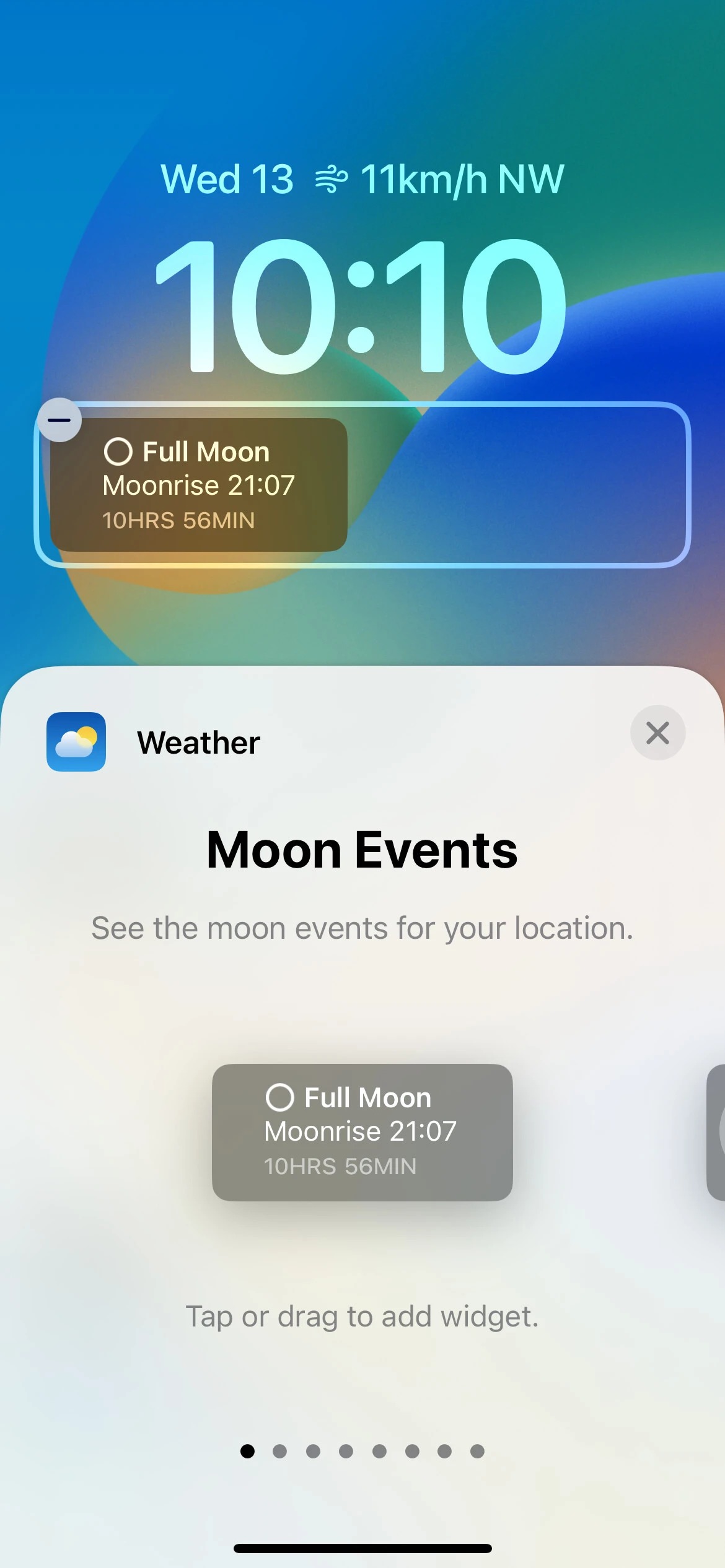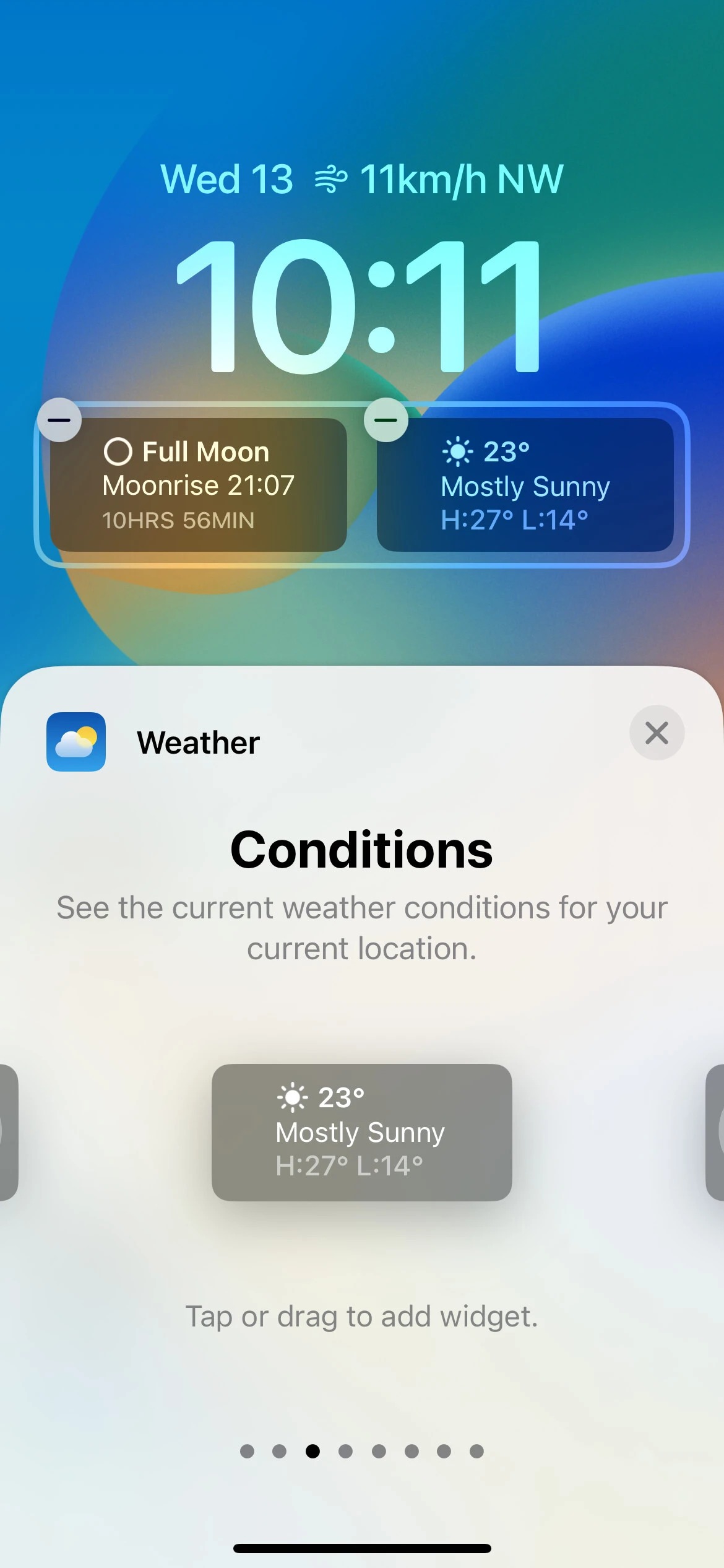 به گفته PhoneArena، در مورد برنامه Weather که آخرین مورد از لیست ویجت‌ها است، این بخش دارای ویجت‌های دو اندازه‌ای برای رویدادهای ماه و شرایط فعلی منطقه است. ویجت رویدادهای ماه، فاز فعلی ماه، زمان طلوع ماه و طول شب را نشان می‌دهد. ویجت Conditions نیز، دما و شرایط فعلی را با بالاترین و کمترین دمای ممکن برای منطقه شما نمایش خواهد داد. اپلیکیشن Weather همچنین دارای شش ویجت کوچک است که رویدادهای خورشید، میزان احتمال بارندگی، دمای فعلی، شاخص UV، کیفیت هوا و سرعت باد را برای منطقه شما به نمایش می‌گذارد.