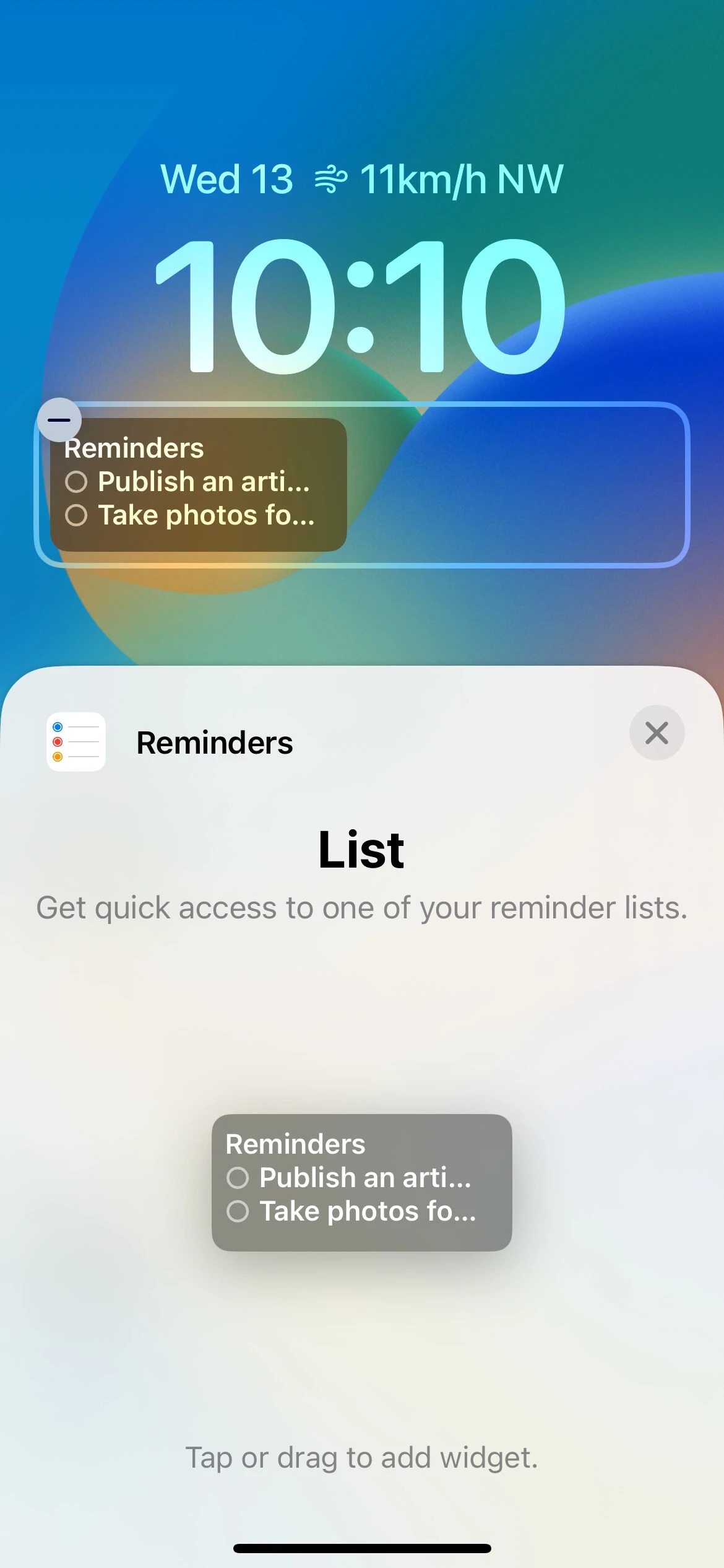 برای برنامه یادآوری‌ها، در حال حاضر یک ویجت با اندازه دوتایی دارید که لیست یادآوری شما را برای روز جاری نمایش می‌دهد و به آن دسترسی می‌دهد.