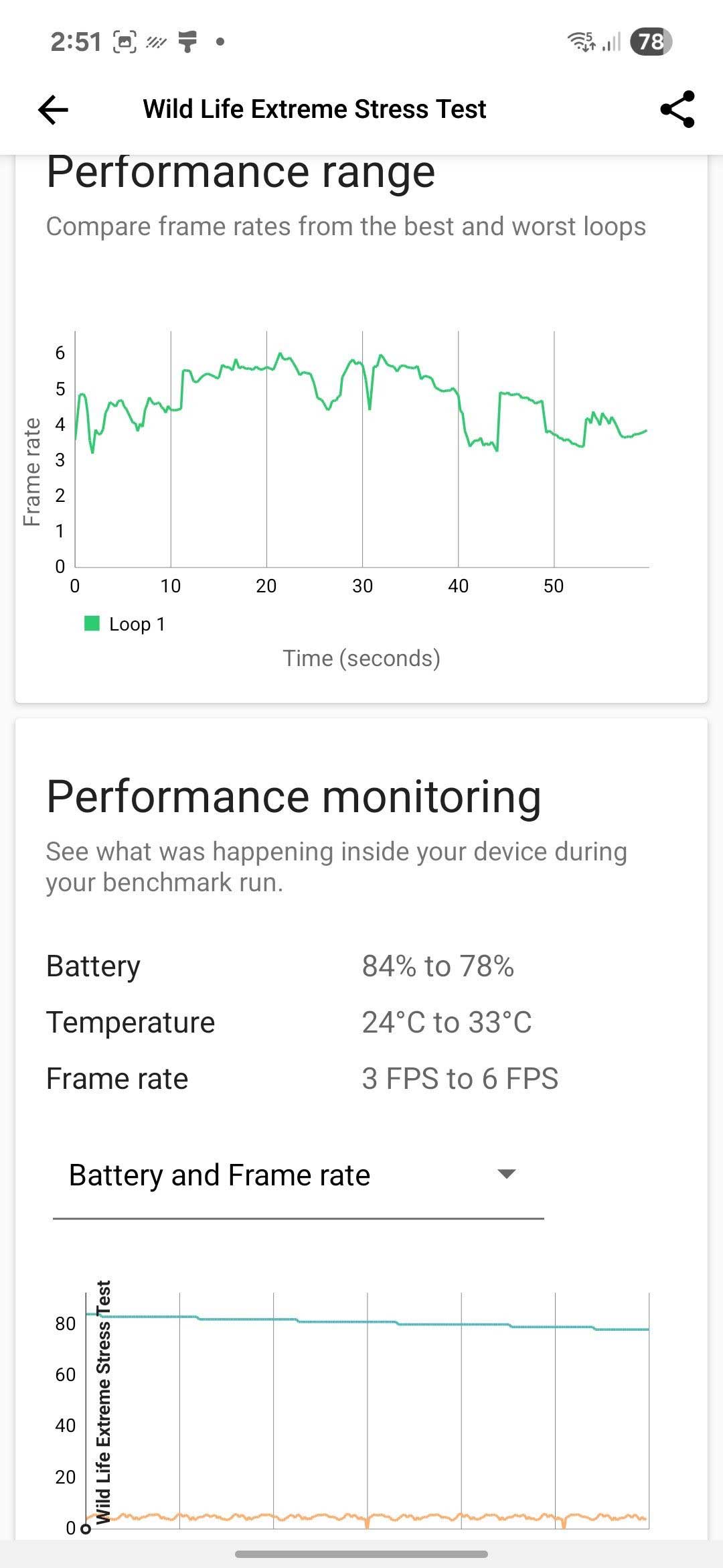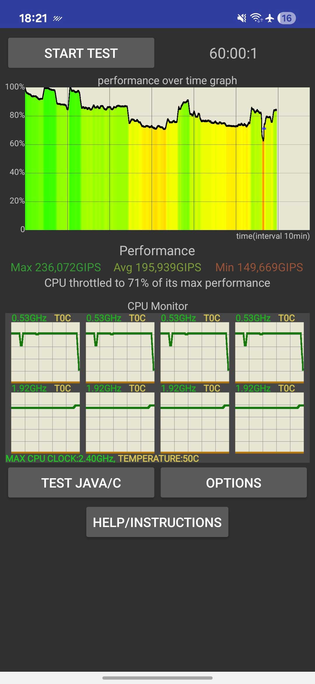 در تست پایداری پردازنده (CPU Stress Test)، گلکسی A26 توانست سرعت کلاک مناسبی را حفظ کند، اما از آنجایی که Exynos 1380 قدرت پردازشی بالایی ندارد، انتظار عملکرد بهتری داشتیم. این تراشه در نهایت به ۷۱٪ از توان تئوری خود کاهش یافت اما در بیشتر مواقع، سطح عملکرد را حدود ۸۰٪ حفظ کرد.
