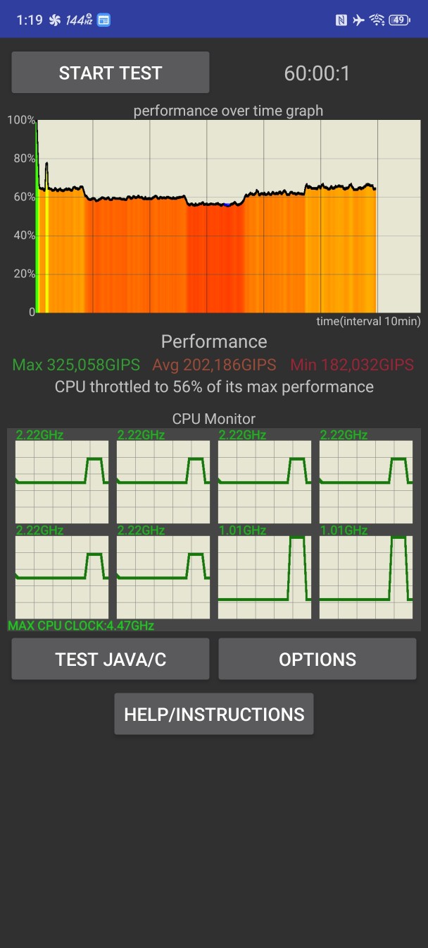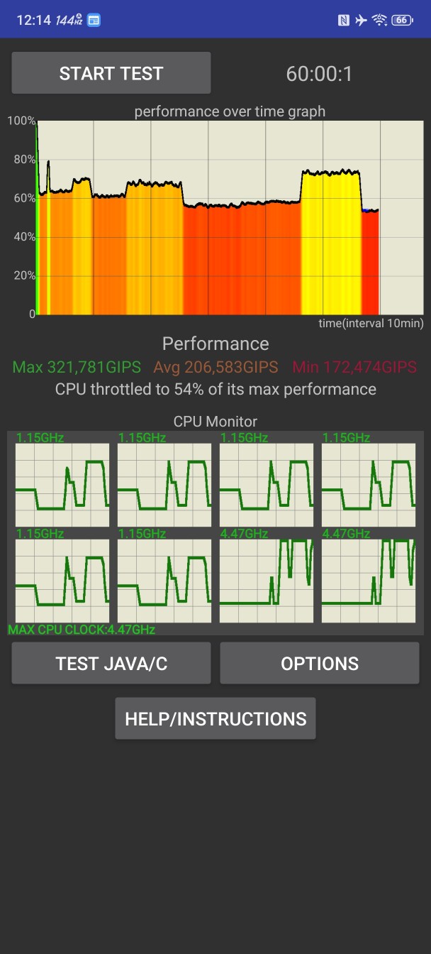 متأسفانه، پردازنده مرکزی همچنان به شدت دچار افت عملکرد (throttling) میشود – با فن روشن، عملکرد به ۵۶٪ از اوج خود کاهش مییابد و بدون فن به ۵۴٪ میرسد (این ارقام برای 10 Pro به ترتیب ۵۷٪ و ۵۴٪ بود). فن تنها کمی از ناهمواریهای نمودار عملکرد را صاف میکند.
