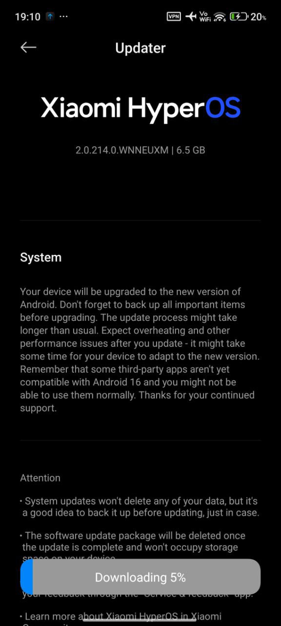 شیائومی به همه کاربران توصیه میکند قبل از نصب آپدیت، از اطلاعات مهم خود نسخه پشتیبان (بکاپ) تهیه کنند. فرآیند نصب ممکن است طولانیتر از حد معمول باشد و کاربران ممکن است با مشکلات عملکردی موقتی، از جمله احتمال داغ شدن بیش از حد، مواجه شوند، زیرا دستگاه در حال تطبیق با نسخه جدید اندروید است. انتظار میرود این مشکلات پس از تکمیل فرآیند آپدیت برطرف شوند.