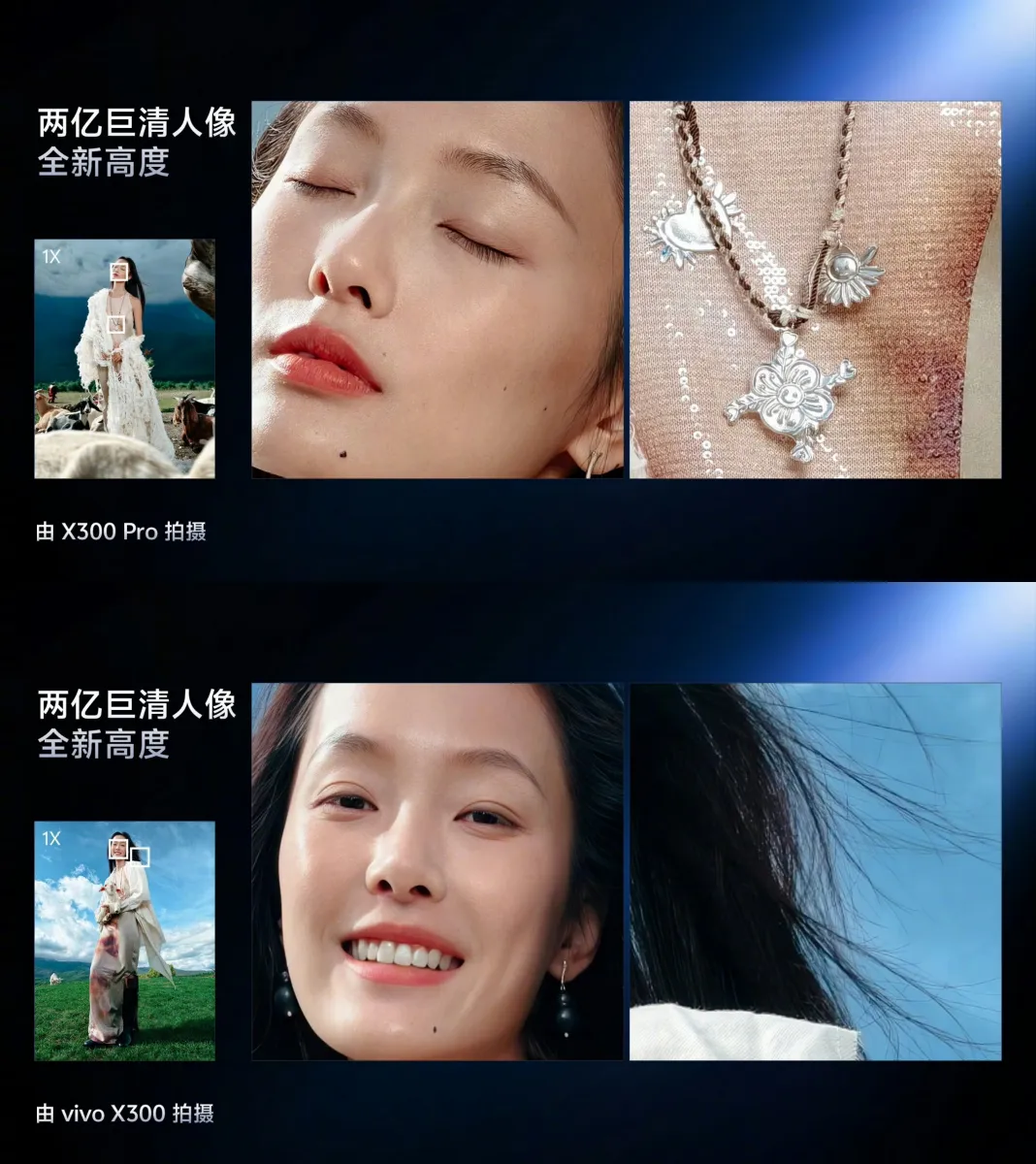 سری X300 از یک مدل بازسازی پرتره با بیش از ۱۰۰ میلیون پارامتر استفاده میکند که با همکاری مدیاتک توسعه یافته و پرترههای ۵۰ مگاپیکسلی با وضوح بالا را در تمام فواصل کانونی ارائه میدهد. همچنین حالت جدید پرتره طبیعی زایس، تصاویری «بدون افزودنی» با بافت پوست واقعی ثبت میکند. برای صحنههای کمنور، الگوریتم «سافتباکس الکترونیکی» نور را ۳۰٪ نرمتر کرده و موتور ردیابی فوکوس اکستریم Blueprint، وضوح تلهفوتو را ۳۵۵٪ و موفقیت فوکوس را ۳۵٪ افزایش میدهد.
