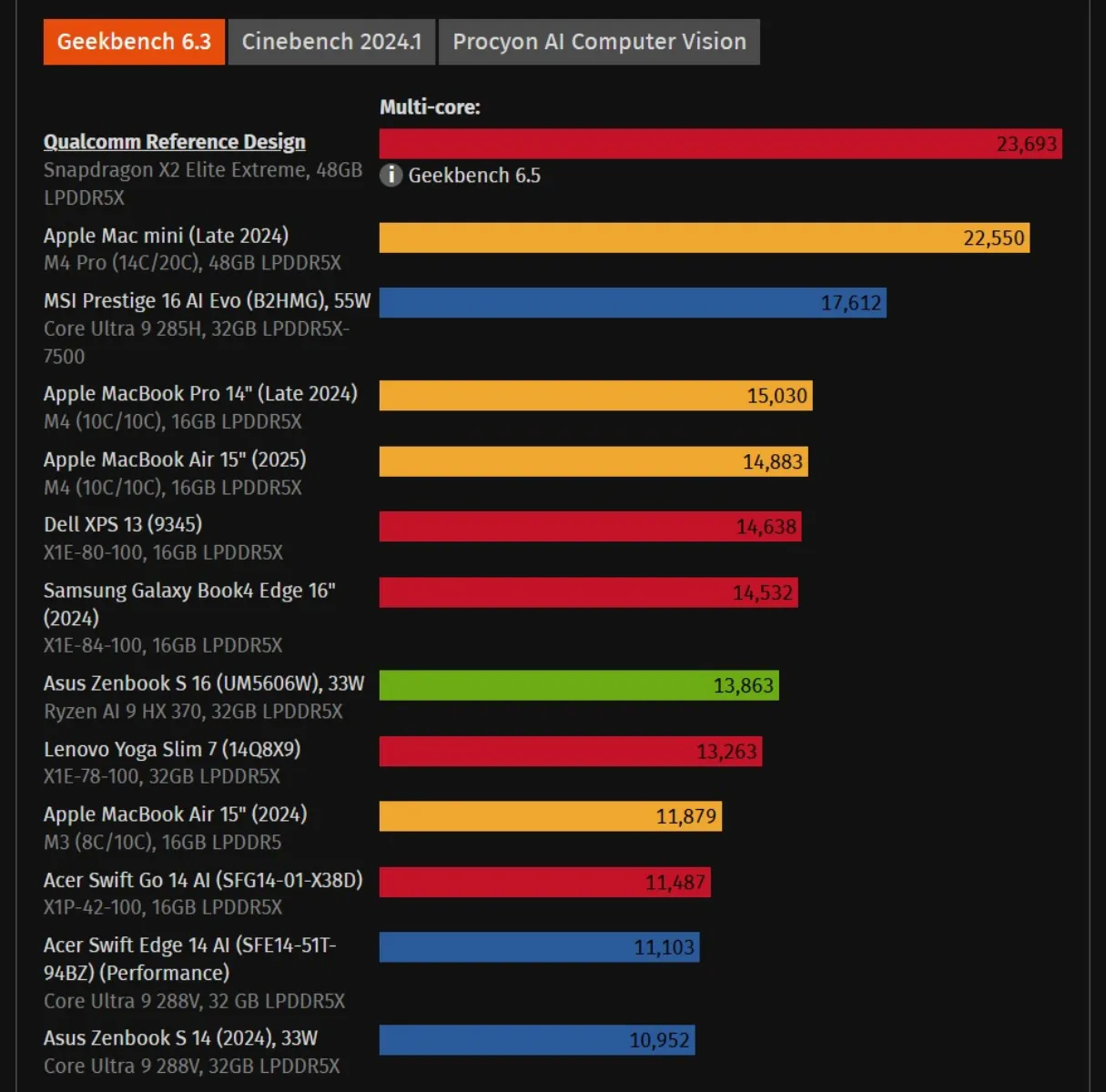 حتی با وجود محدودیت توان بالقوه بالاتر در برد مرجع، اسنپدراگون X2 الیت اکستریم حریف M4 پرو نشد. این موضوع نشان میدهد که نسخههای نهایی این تراشه که در لپتاپهای نیمه اول سال ۲۰۲۶ به کار میروند، ممکن است امتیازات پایینتری نیز کسب کنند.