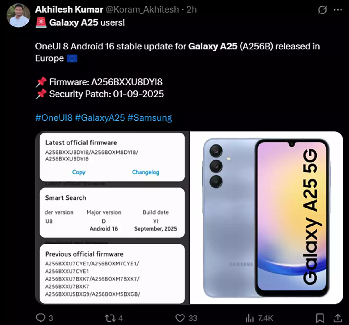 سامسونگ امروز را با عرضه به‌روزرسانی One UI 8 برای سری Galaxy S22 آغاز کرد. همچنین خبر خوب برای کاربران ایرانی این بود که آپدیت One UI 8 گلکسی A34 سامسونگ در ایران برای بعضی کاربران منتشر شد. همچنین حالا خبر می‌رسد که آپدیت One UI 8 گلکسی A25 سامسونگ منتشر شده، البته فعلا در اروپا و به زودی در ایران.