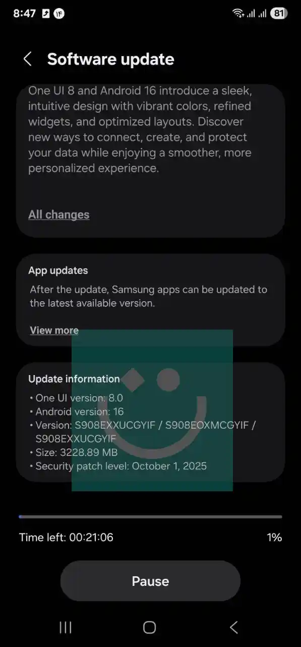 همانطور که در اسکرین‌شات بالا مشاهده می‌کنید، حجم به‌روزرسانی One UI 8 گلکسی S22 Ultra در ایران برابر ۳.۲ گیگابایت است. بیلد این آپدیت S908EXXUCGYIF بوده و وصله امنیتی ماه جاری میلادی یعنی سپتامبر را دارد.