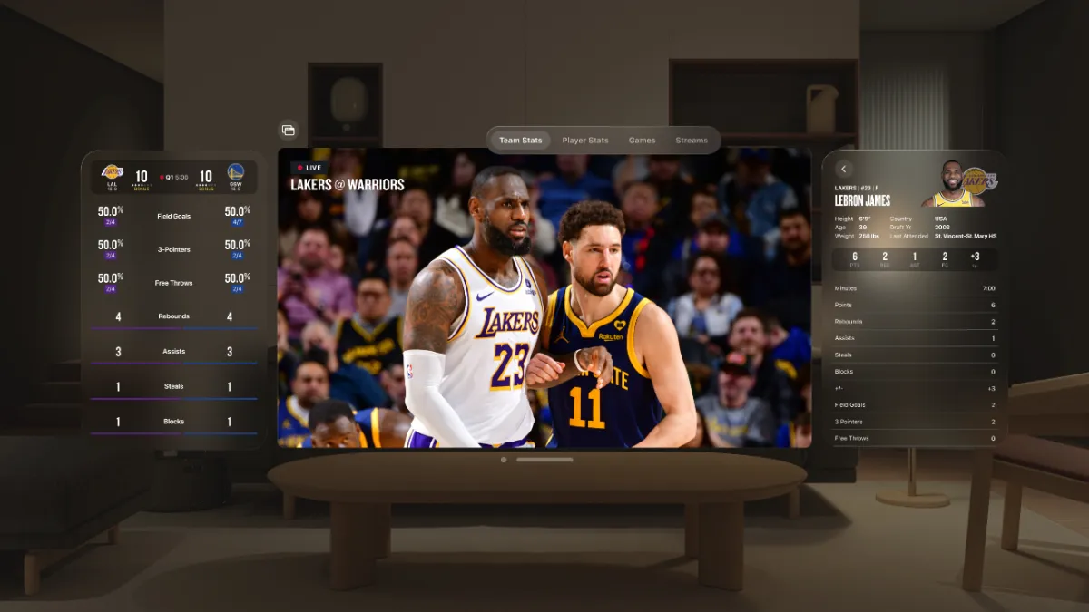 در فصل آینده، کاربران هدست ویژن پرو اپل قادر خواهند بود بازیهای منتخب لسآنجلس لیکرز را بهصورت پخش زنده در یک فید فراگیر تماشا کنند. این قابلیت که از آن بهعنوان اولین «اپلیکیشن حیاتی» (killer app) هدست گرانقیمت اپل شناخته میشود، تجربهای «همهجانبه» از مشاهده رویدادهای ورزشی را فراهم میکند.
