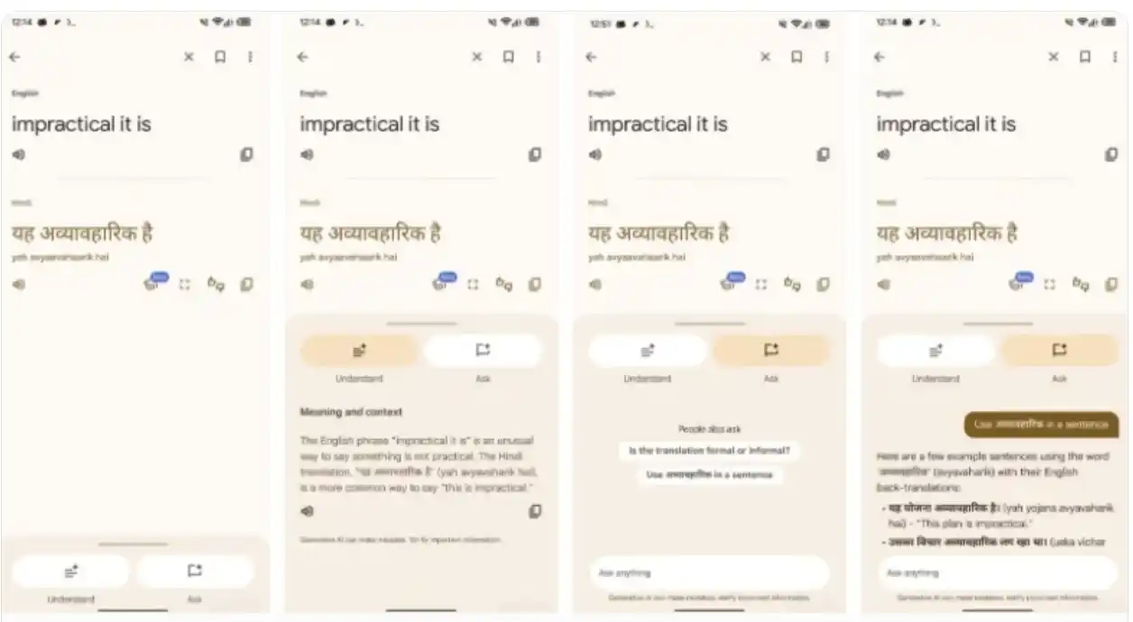 یک آمار شگفتانگیز: به گفته گوگل، اپلیکیشن ترنسلیت ماهانه یک تریلیون کلمه را ترجمه میکند. اما همیشه یک ترجمه ساده کافی نیست. گوگل در حال آزمایش یک ویژگی جدید است که دکمه “Ask a Follow-up” را با دو دکمه قدرتمندتر جایگزین میکند: