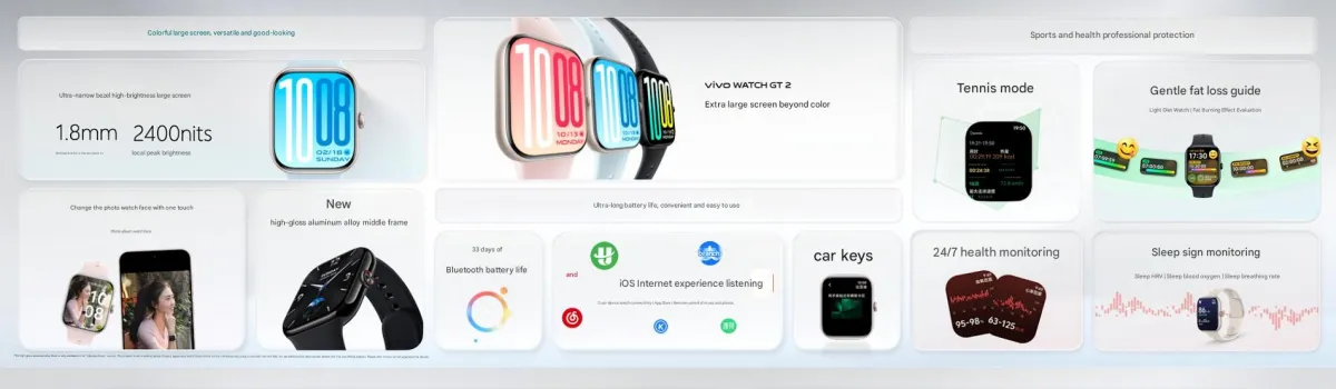درکنار سری ویوو X300، ویوو امروز از واچ GT 2، جدیدترین ساعت هوشمند خود با بدنه آلیاژ آلومینیوم، رونمایی کرد. این ساعت دارای طراحی مربعی صفحه با نمایشگر ۲.۰۷ اینچی AMOLED منحنی 2.5D است که حداکثر روشنایی ۲۴۰۰ نیت را ارائه میدهد و در نسخههای بلوتوث و eSIM عرضه میشود.