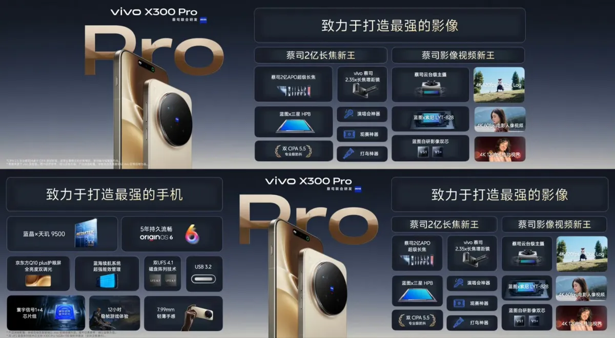 با شروع از مدل پرچم‌دار، ویوو X300 پرو یک مجموعه دوربین سه‌گانه پشتی ارتقایافته از زایس را ارائه می‌دهد. این گوشی دارای یک سنسور اصلی ۵۰ مگاپیکسلی Sony LYT-828 با اندازه ۱/۱.۲۸ اینچ، دیافراگم f/1.57، لرزشگیر اپتیکال گیمبال (gimbal OIS) و فاصله کانونی ۲۴ میلی‌متر (برخلاف ۳۵ میلی‌متر X200 Ultra) است. این گوشی همچنین یک سنسور فوق‌عریض ۵۰ مگاپیکسلی Samsung JN1 با اندازه ۱/۲.۷۶ اینچ و یک سنسور جدید ۲۰۰ مگاپیکسلی Samsung HPB با اندازه ۱/۱.۴ اینچ برای لنز تله‌فوتو با زوم اپتیکال ۳.۷ برابر خود دریافت می‌کند. در جلو، ویوو یک سنسور ۵۰ مگاپیکسلی دیگر از نوع Samsung JN1 را برای سلفی و تماس‌های ویدیویی گنجانده است که اکنون از فوکوس خوکار نیز پشتیبانی می‌کند.