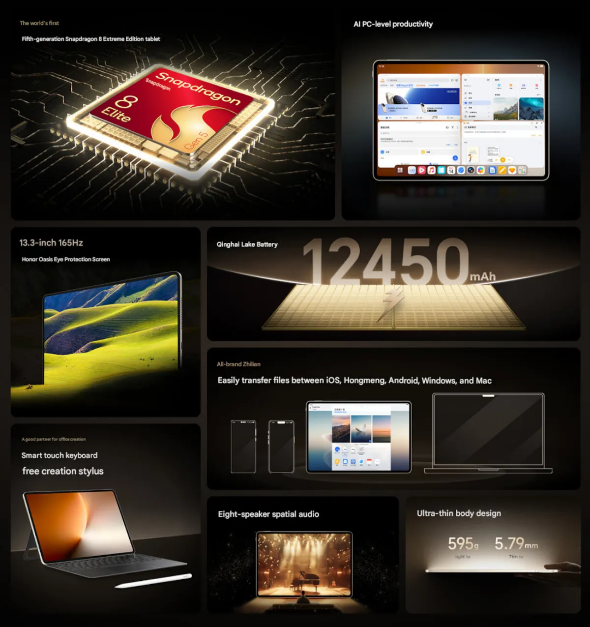 آنر در رویداد ویژه امروز خود در چین، از تبلت پرچمدار مجیک پد ۳ پرو (MagicPad 3 Pro) رونمایی کرد. این دستگاه که بهعنوان اولین تبلت جهان با تراشه تازهمعرفیشده اسنپدراگون ۸ الیت نسل ۵ شناخته میشود، به یک صفحهنمایش بزرگ ۱۳.۳ اینچی +3.2K از نوع LCD با نسبت صفحهنمایش به بدنه بالای ۹۱ درصد، نسبت طلایی ۳:۲، بالاترین نرخ نوسازی در رده خود یعنی ۱۶۵ هرتز و حداکثر روشنایی ۱۱۰۰ نیت نیز مجهز شده است.