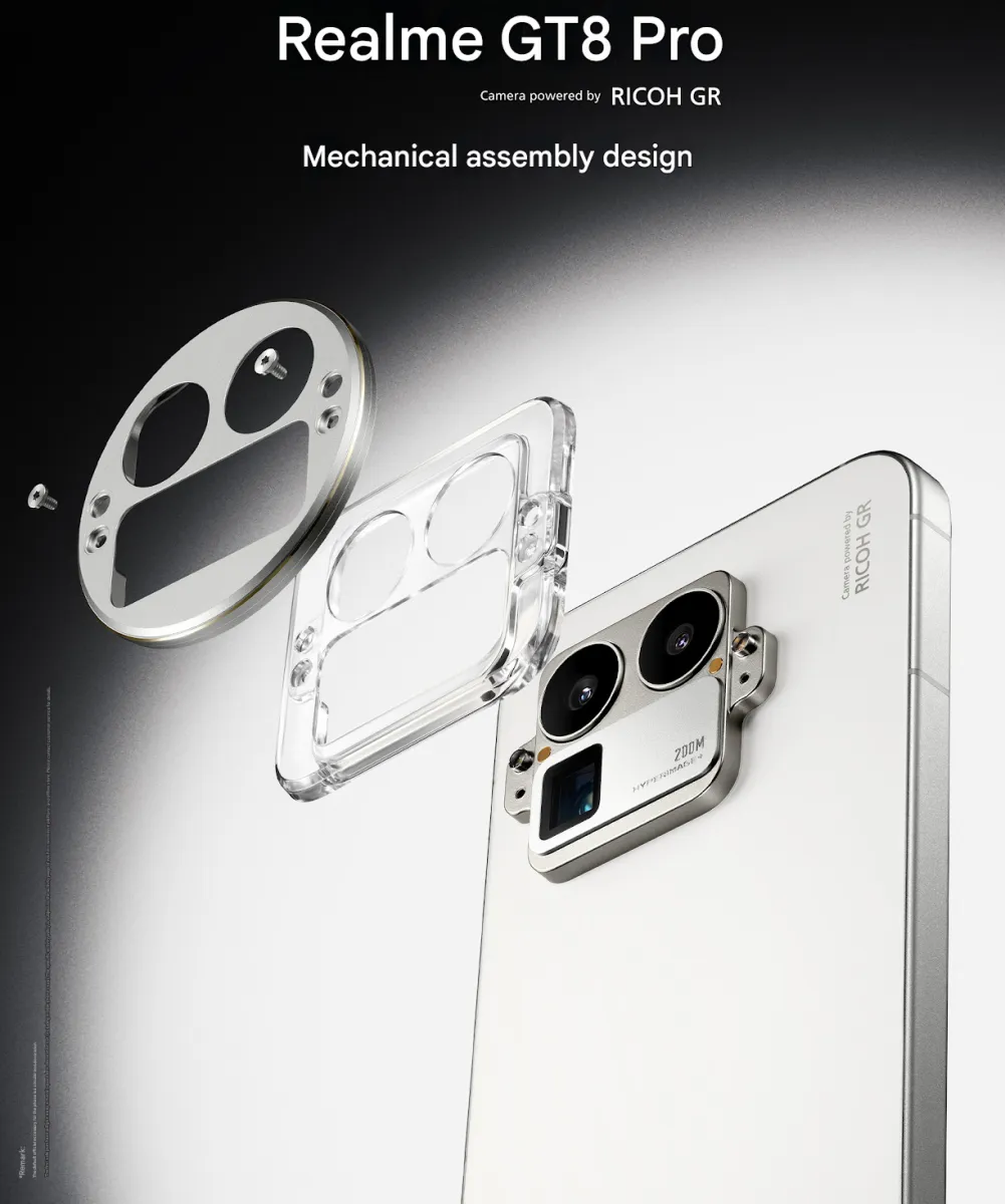 ریلمی GT 8 Pro اولین گوشی خواهد بود که از سیستم تصویربرداری ریکو GR بهره میبرد. ریلمی پیش از این استفاده از تراشه اسنپدراگون ۸ الیت نسل ۵ را برای این گوشی تأیید کرده بود. این شرکت همچنین گفته است که این گوشی دارای یک نمایشگر 2K 144Hz Sky Screen از شرکت BOE خواهد بود که از مواد درخشان +Q10 سفارشی استفاده میکند. تصویر منتشر شده نیز وجود یک دوربین تلهفوتوی پریسکوپی ۲۰۰ مگاپیکسلی را تأیید میکند. این گوشی با سیستمعامل اندروید ۱۶ و رابط کاربری realme UI 7.0 عرضه خواهد شد.