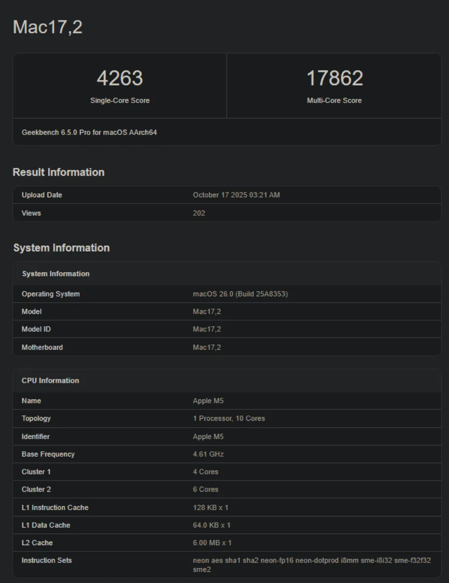 بر اساس این نتیجه تأییدنشده، تراشه M5 امتیاز خیره‌کننده ۴,۲۶۳ را برای عملکرد پردازشی تک‌هسته‌ای به‌دست آورده است که بالاترین امتیاز تک‌هسته‌ای به‌شمار می‌رود که تاکنون در پایگاه داده گیک‌بنچ ۶ برای هر پردازنده مک یا کامپیوتر شخصی ثبت شده است.