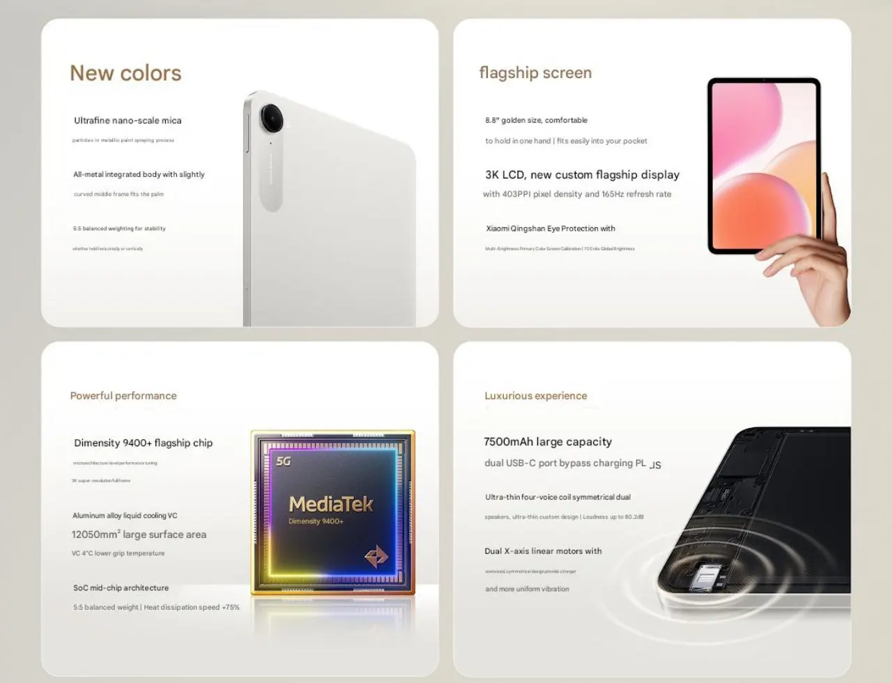 برای یادآوری، شیائومی تبلت ردمی K Pad را در ماه ژوئن (تیر ۱۴۰۴) با تراشه مدیاتک دیمنسیتی ۹۴۰۰ پلاس و یک نمایشگر ۸.۸ اینچی IPS در بدنهای به ابعاد ۲۰۵.۱ × ۱۳۲ × ۶.۵ میلیمتر و وزن ۳۲۶ گرم عرضه کرد. این تبلت که رقیبی برای دستگاههایی مانند آیپد مینی ۷ اپل محسوب میشود، کمتر از یک ماه پیش با نام شیائومی پد مینی برای بازارهای جهانی تغییر نام داد.