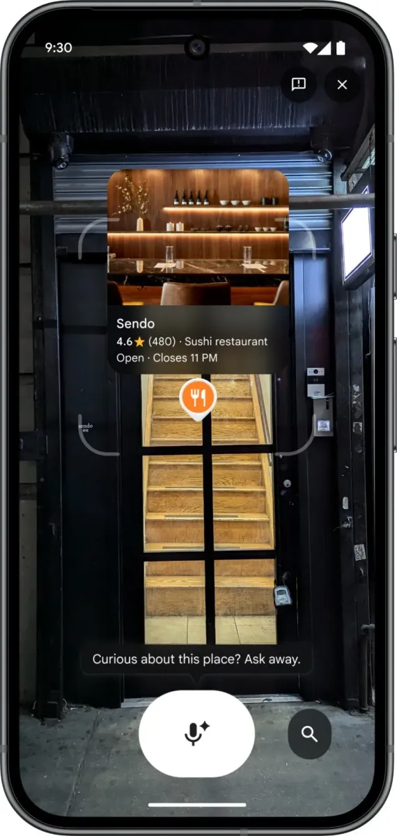 یکی دیگر از قابلیت‌های بسیار جالب، یکپارچگی با گوگل لنز (Google Lens) است. شما قادر خواهید بود از دوربین خود استفاده کنید و از مپس بخواهید به سؤالات شما درمورد مکان‌هایی که می‌بینید پاسخ دهد و اطلاعات بیشتری درمورد آن‌ها دریافت کنید. اگر تابه‌حال ده‌ها بار از کنار یک مغازه یا رستوران رد شده‌اید و همیشه کنجکاو بوده‌اید که فضای داخل آن چگونه است، این قابلیت یک راه آسان برای فهمیدن آن به‌نظر می‌رسد.