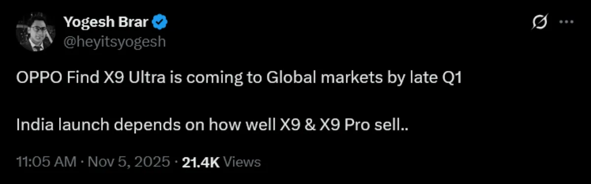 این افشاگر همچنین اضافه کرده است که عرضه فایند X9 اولترا در بازار هند عمدتاً بهمیزان فروش مدلهای فایند X9 و X9 پرو در این کشور بستگی خواهد داشت. این گوشیها قرار است در ماه جاری میلادی در هند عرضه شوند، اما تاریخ دقیق عرضه هنوز تأیید نشده است.