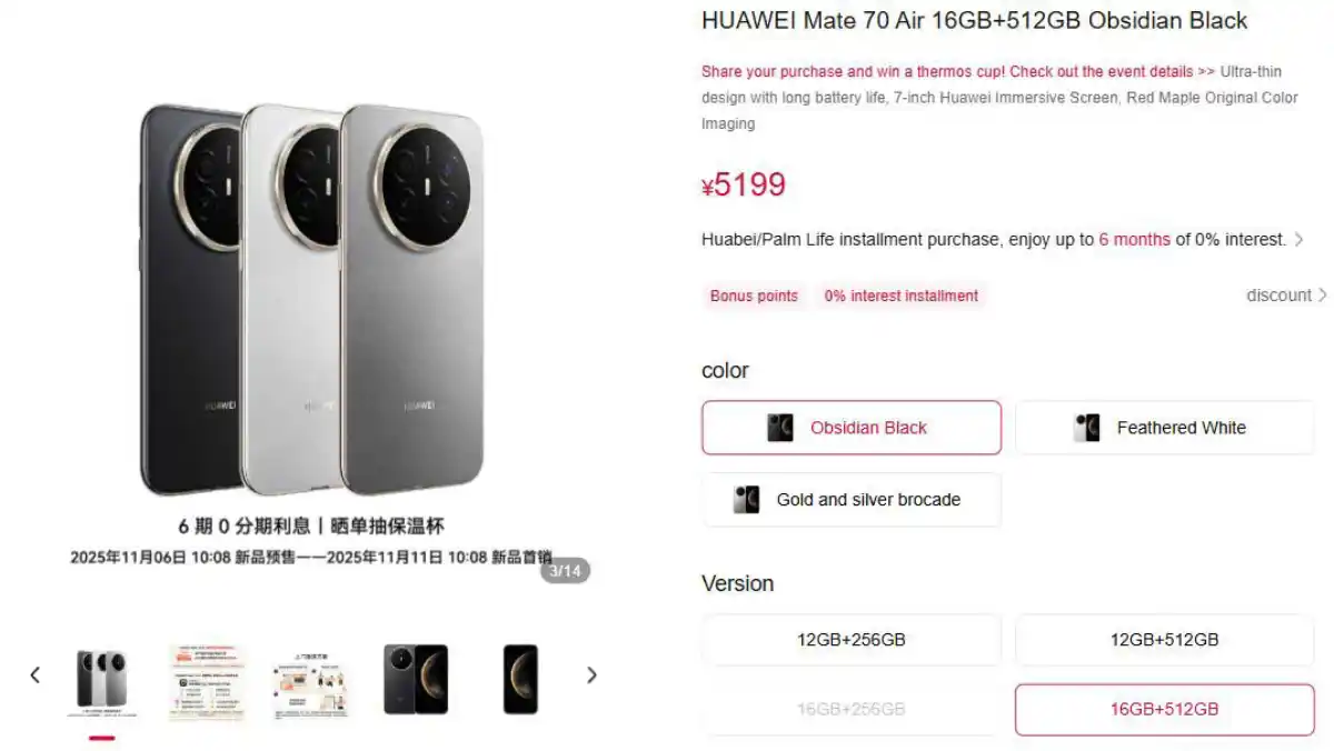 پیش‌فروش هواوی میت ۷۰ ایر از امروز (پنح‌شنبه ۱۵ آبان) در چین شروع خواهد شد. در حال حاضر، تاریخ عرضه جهانی این پرچمدار باریک، هنوز تأیید نشده است.