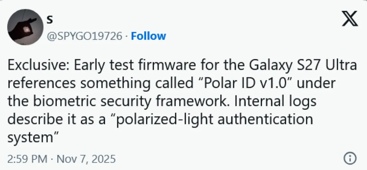 یک افشاگر با نام کاربری SPYGO19726 در شبکه اجتماعی X، بهتازگی پستی را منتشر کرده که در آن ادعا میکند فریمور آزمایشی اولیه گلکسی S27 اولترا به «Polar ID v1.0» در چارچوب امنیتی بیومتریک خود اشاره دارد. لاگهای داخلی همراه با آن، این اصطلاح را بهعنوان یک «سیستم احراز هویت با نور قطبیده» (polarized-light authentication system) توصیف میکنند.