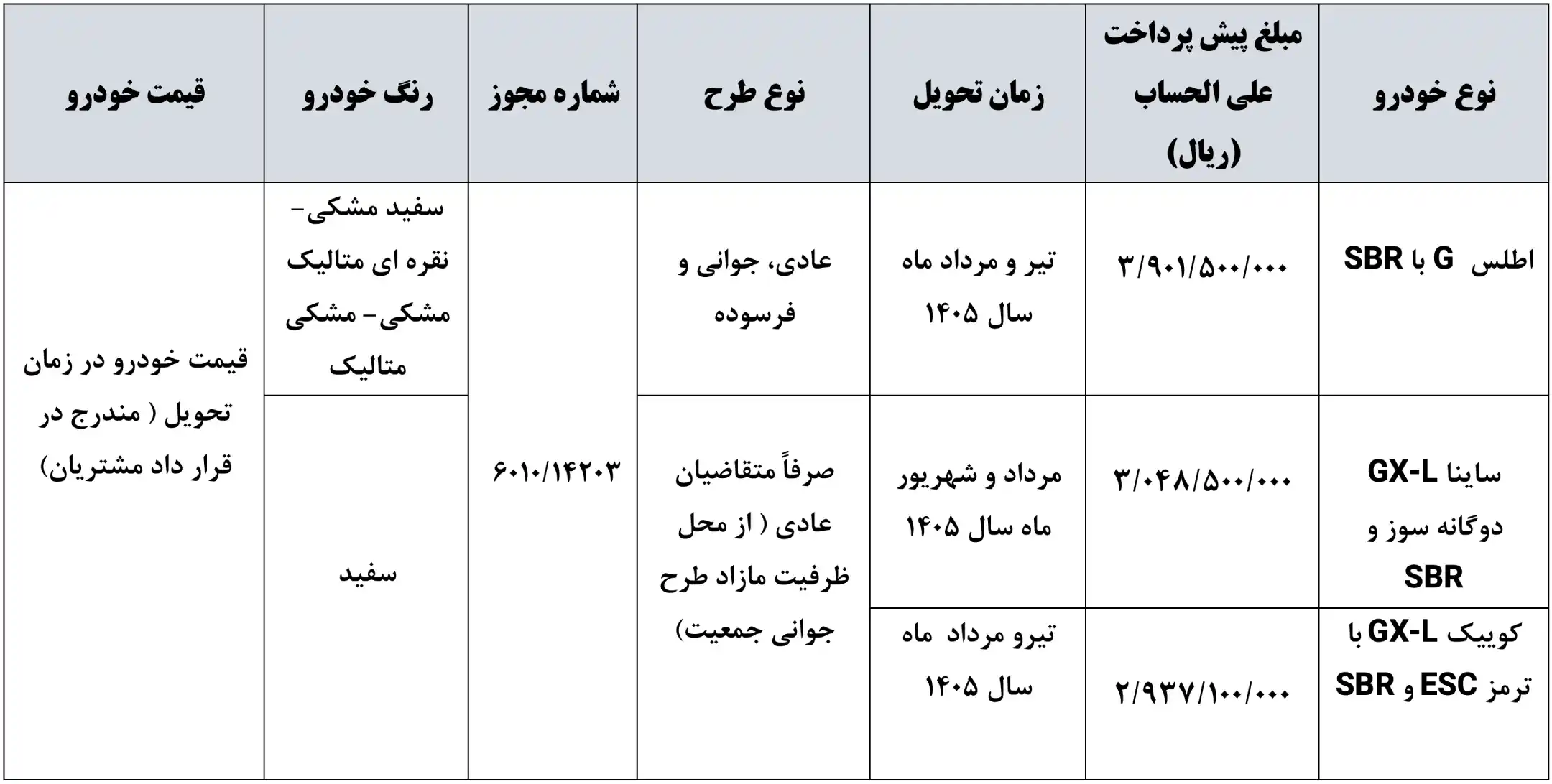 | نام خودرو | مبلغ پیشپرداخت (تومان) | موعد تحویل |