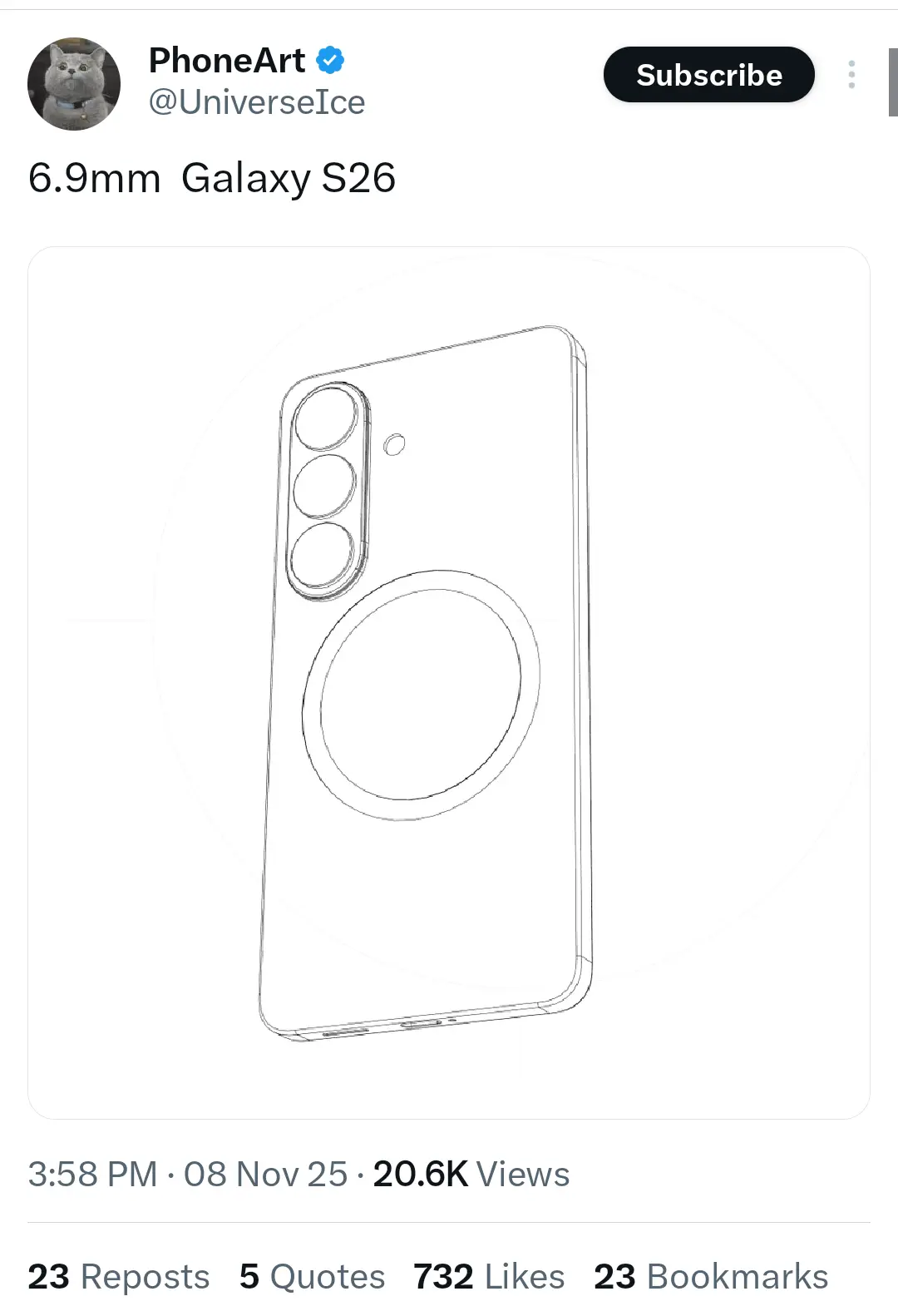 افشاگر معروف، UniverseIce@، تصویری را به اشتراک گذاشته که ادعا می‌کند دیاگرام مدل پایه گلکسی S26 است. این افشاگر که معمولاً قابل اعتماد است، ادعا می‌کند که این گوشی آینده سامسونگ تنها ۶.۹ میلی‌متر ضخامت دارد.
