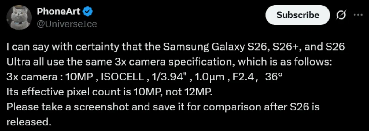 Ice Universe که پیش‌تر این سنسور تله فوتو 3x جدید را تأیید کرده بود، اکنون بر این اطلاعات تأکید کرده است. او با «قطعی» خواندن این خبر، ادعا می‌کند که هر سه مدل گلکسی S26 از سنسور تله فوتو ۱۰ مگاپیکسلی ISOCELL S5K3LD با دیافراگم f/2.4 و برش مؤثر ۱۰ مگاپیکسلی از سنسور استفاده خواهند کرد. این افشاگر آنقدر به اطلاعات خود اطمینان دارد که همه را به چالش کشیده تا «اسکرین‌شات بگیرند و آن را ذخیره کنند» و با مشخصات واقعی دوربین گلکسی S26 در زمان عرضه رسمی در فوریه ۲۰۲۶ (بهمن/اسفند ۱۴۰۴) مقایسه کنند.