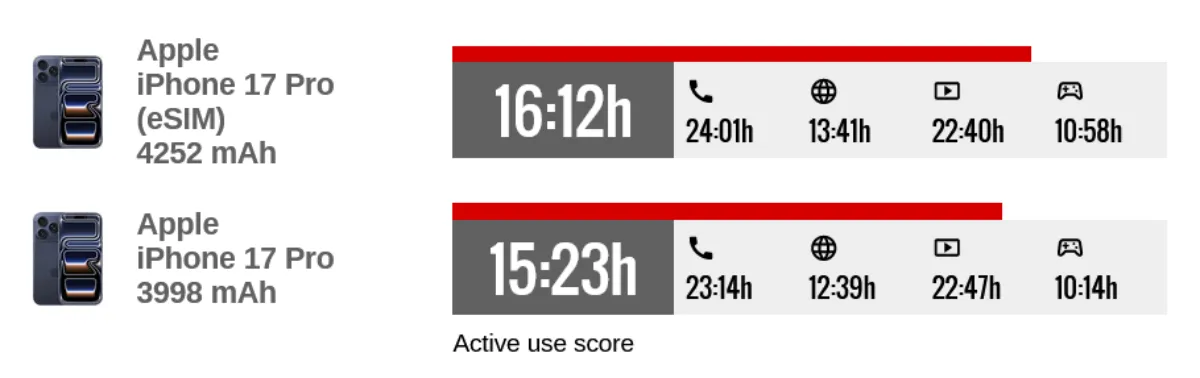 آیفون ۱۷ پرو نسخه eSIM (مدل A3256) با باتری ۴۲۵۲ میلی‌آمپرساعتی خود، امتیاز استفاده فعال ۱۶ ساعت و ۱۲ دقیقه را کسب کرد که ۴۹ دقیقه بیشتر از همتای نانو سیم‌کارت خود (مدل A3523) با باتری ۳۹۹۸ میلی‌آمپرساعتی است.