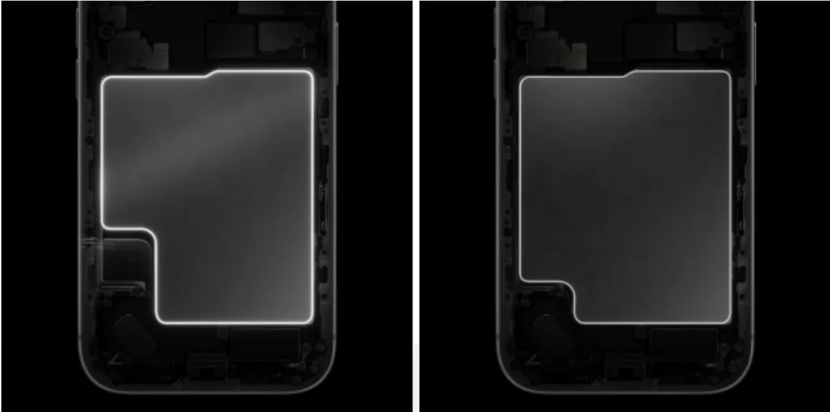 اندازه باتری آیفون ۱۷ پرو با نانو سیم‌کارت (راست) و eSIM (چپ)