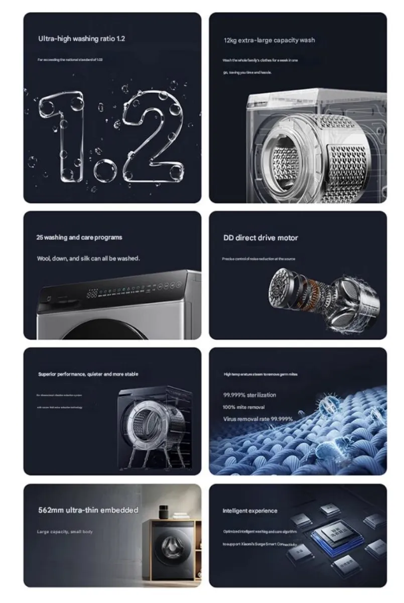 این دستگاه با توان ۱۸۰۰ وات کار می‌کند و سرعت چرخش آن به ۱۲۰۰ دور در دقیقه می‌رسد. شیائومی ادعا می‌کند که نسبت عملکرد شستشوی این دستگاه ۱.۲ است و از فناوری جریان آب پویای سه‌بعدی (3D dynamic water-flow) برای حذف مؤثر لکه‌ها استفاده می‌کند. این سیستم همچنین دارای حسگر هوشمند تشخیص بار است که سرعت دیگ و جریان آب را براساس وزن و نوع پارچه تنظیم می‌کند.