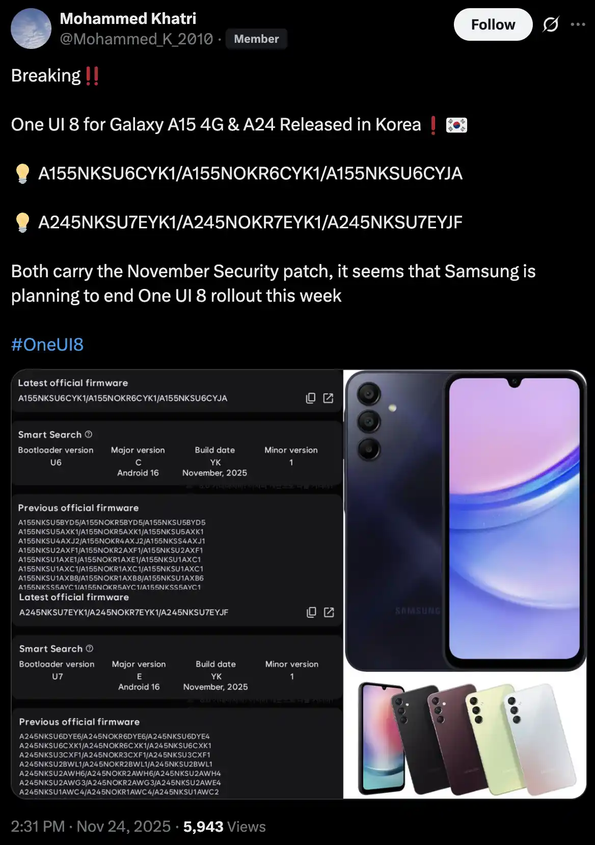 شرکت سامسونگ روند انتشار به‌روزرسانی بزرگ رابط کاربری One UI 8 مبتنی بر سیستم‌عامل Android 16 را برای دو گوشی محبوب سری A، یعنی Galaxy A15 4G و Galaxy A24 4G آغاز کرده است. این به‌روزرسانی هم‌اکنون در کشور کره جنوبی منتشر شده و طبق برنامه سامسونگ، به زودی در سایر کشورهای جهان نیز در دسترس کاربران قرار خواهد گرفت. همچنین امروز آپدیت One UI 8 گلکسی A16 مدل 4G نیز منتشر شده بود.