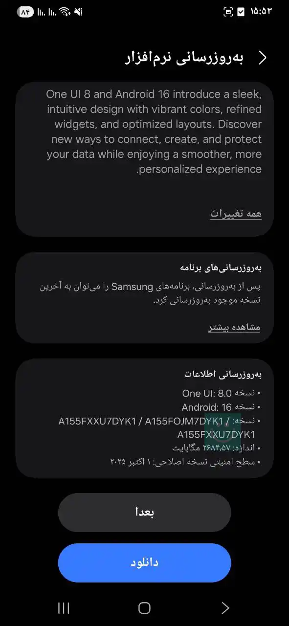 اسکرین شات آپدیت One UI 8 گلکسی A15 مدل 4G در ایران