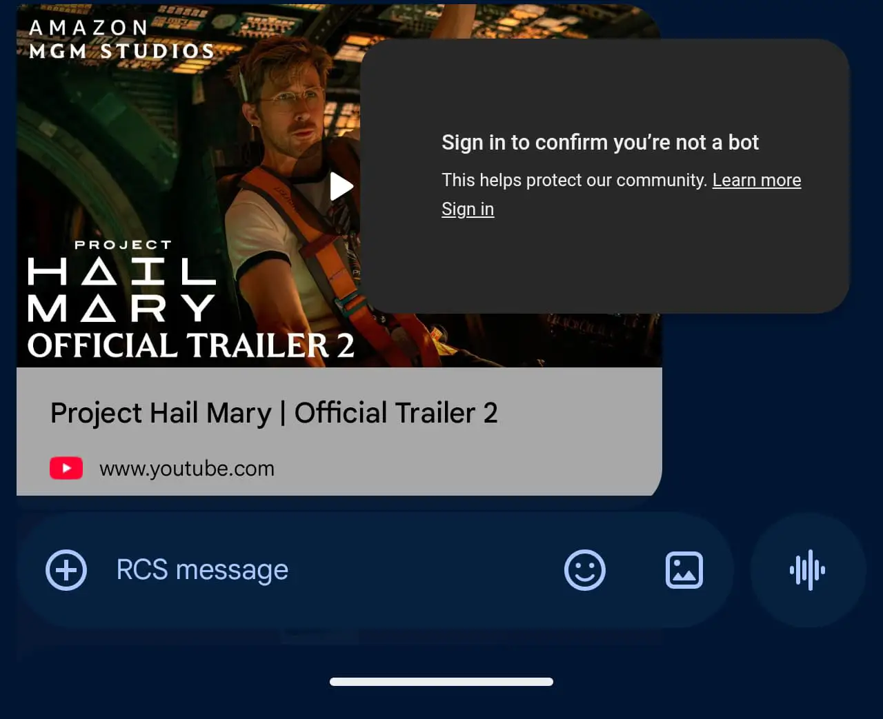 حتی اگر تنظیمات PiP سیستم را غیرفعال کنید، ویدیو به صورت تمامصفحه در مرورگر داخلی گوگل مسیجز باز میشود. همچنین یک باگ آزاردهنده دیگر وجود دارد: پیام «Sign in to confirm you’re not a bot» (وارد شوید تا تأیید کنید ربات نیستید) ظاهر میشود، اما گزینهای برای انجام این کار در پنجره پلیر وجود ندارد!