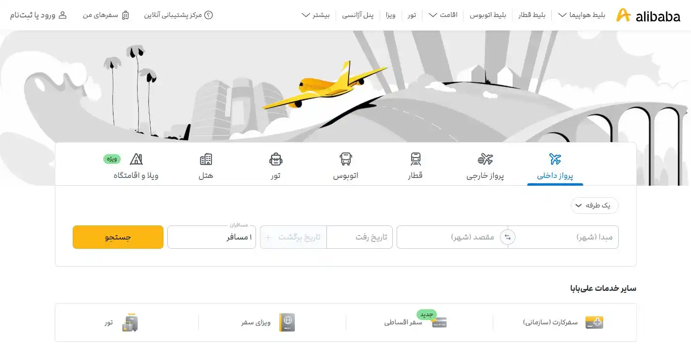 علی بابا مرجع خرید بلیط هواپیما، قطار و اتوبوس و همچنین رزرو اینترنتی هتل، تور و انواع اقامتگاه است. کاربران می‌توانند در سایت یا اپلیکیشن آن، با جستجو و فیلتر کردن نتایج بر اساس قیمت یا سایر ویژگی‌ها، گزینه مناسب خود را پیدا و خریداری کنند.