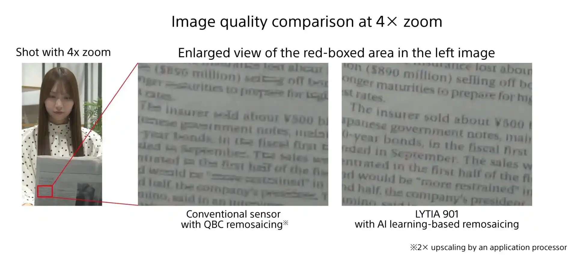 سنسور سونی دارای ساختار QQBC است که ۱۶ پیکسل مجاور همرنگ را دسته‌بندی می‌کند. سونی «بازچینی موزائیکی مبتنی بر هوش مصنوعی» (AI-driven remosaicing) را مستقیماً در سنسور تعبیه کرده است. این ویژگی امکان زوم ۴ برابری با کیفیت بالا و ضبط ویدیوی روان را بدون واگذاری پردازش به پردازنده تصویر (ISP) فراهم می‌کند.